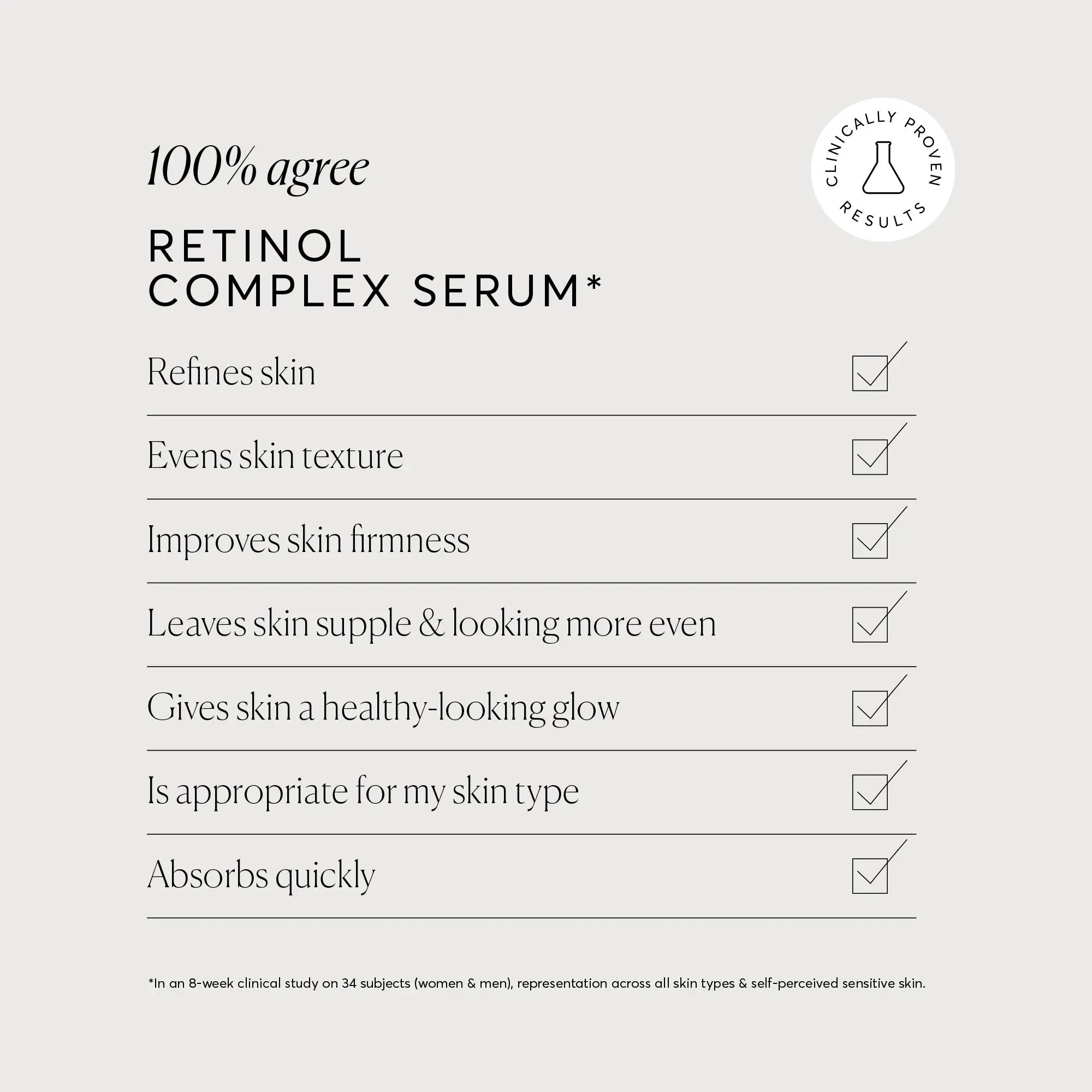 Our Retinol Complex Serum is clinically proven to improve the appearance of fine lines and wrinkles plus skin tone and texture in just 8 weeks.*