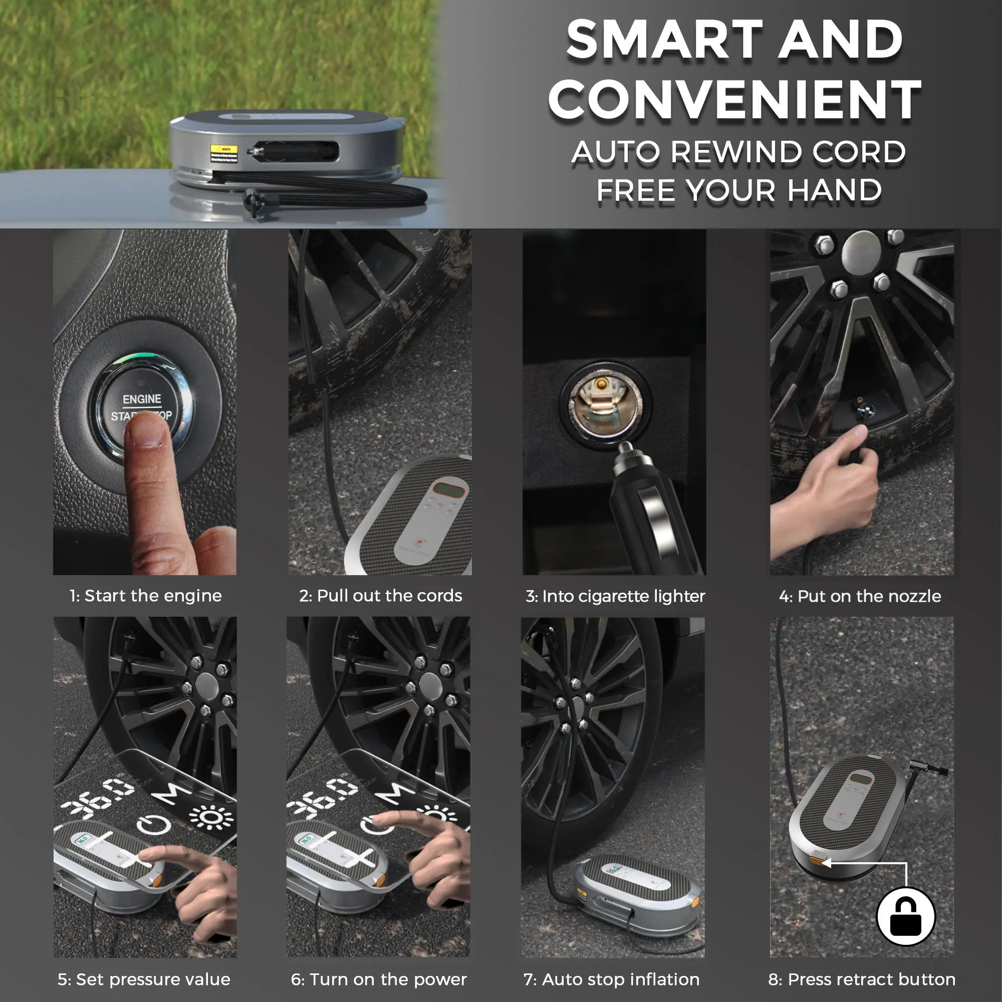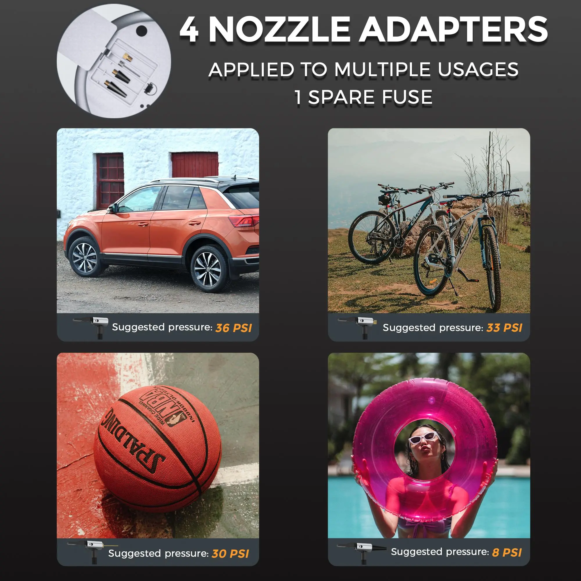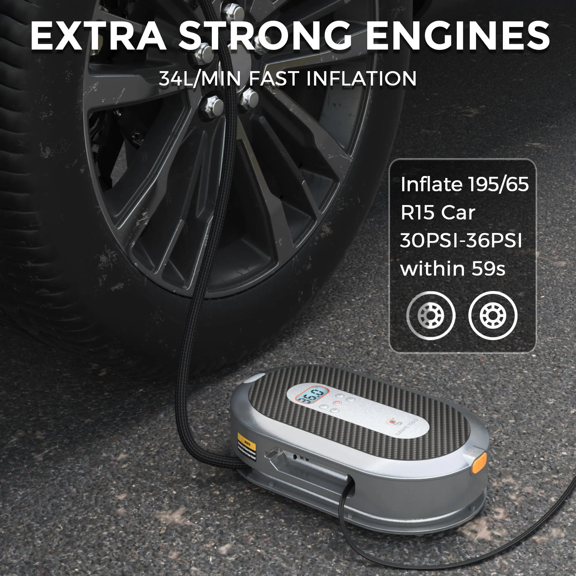 Effortlessly inflate your tires with this powerful 150PSI DC12V compressor. It offers fast inflation at 34L/Min, ensuring quick and efficient results. The compact size measures 10*6*3in, making it ideal for cars, bikes, and more. Its 120W power and 10Amps ensure reliable operation.
