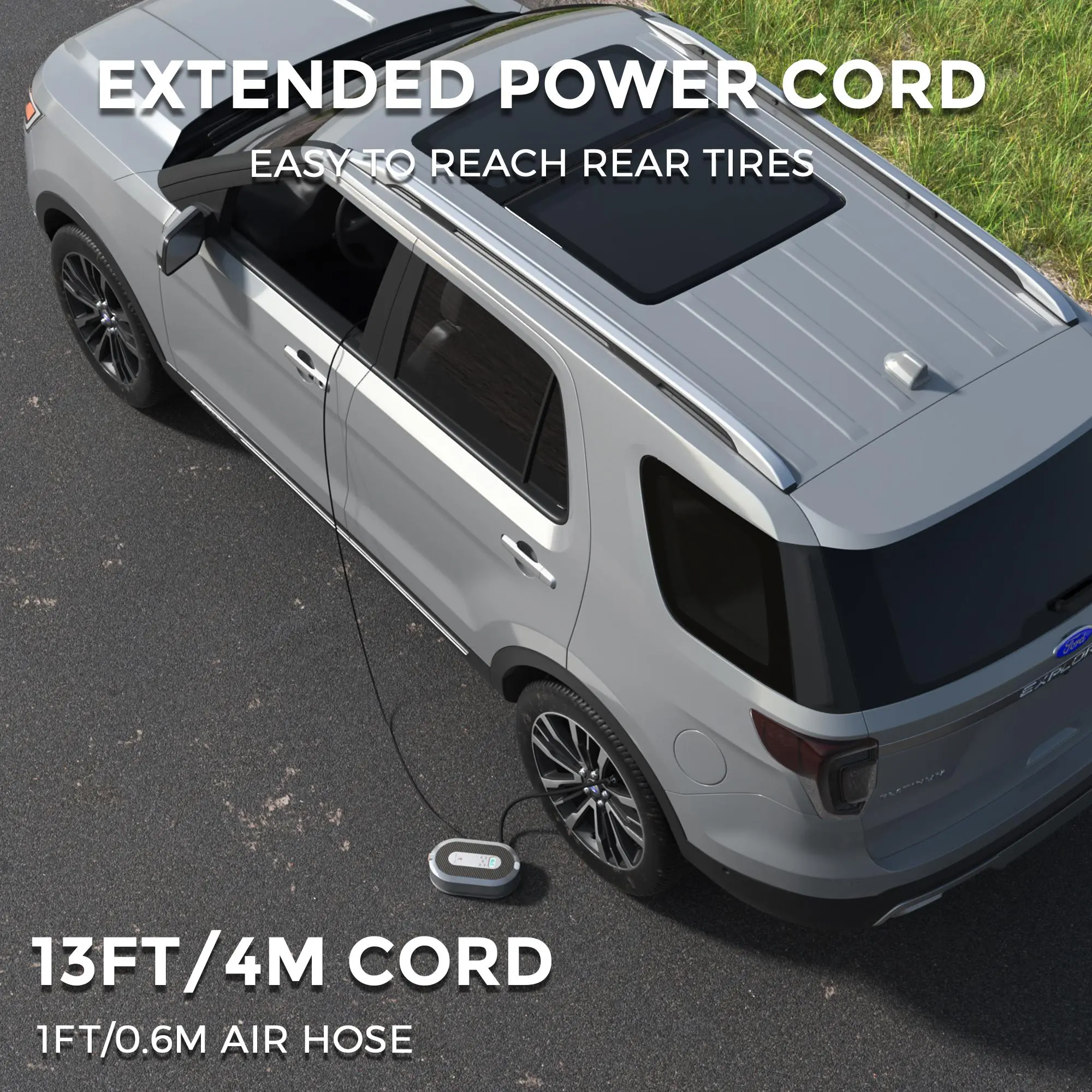 Compact and portable, it fits anywhere in your car. The built-in storage compartment keeps nozzles within reach. The power cable is 13ft long, and the air hose is 1ft. Operate for up to 15 minutes.