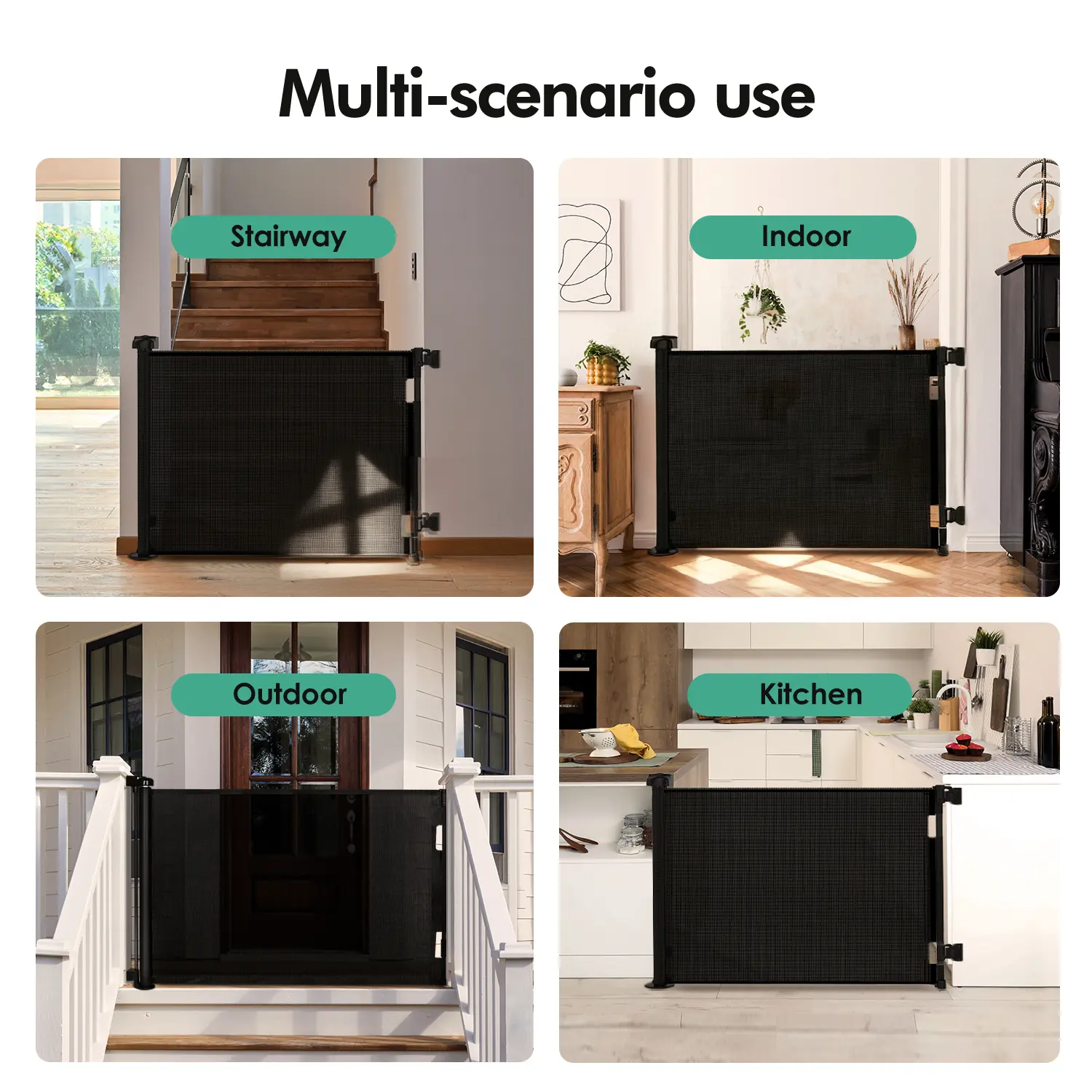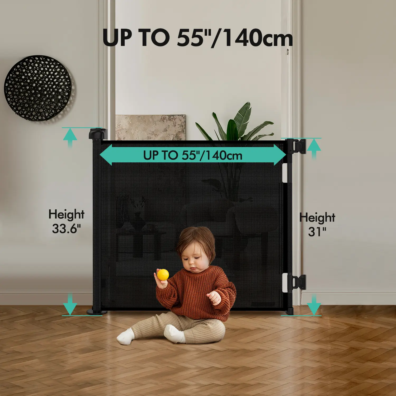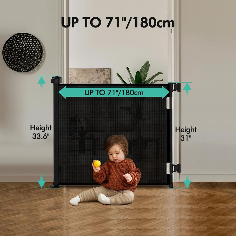 The Retractable Baby Gate is a versatile mesh gate, ideal for any home. It stands 33" tall, extending up to 55"/71"/118" wide. Perfect for doorways, stairs, and hallways, both indoors and outdoors. This grey playpen ensures child safety with adjustable dimensions. Keep your little ones secure and add elegance to your decor. 🏠