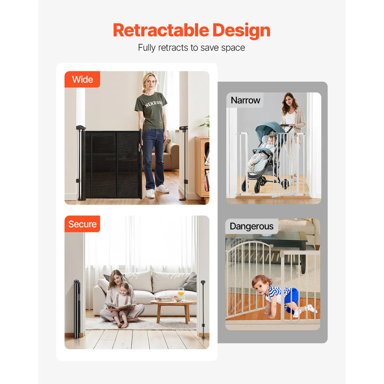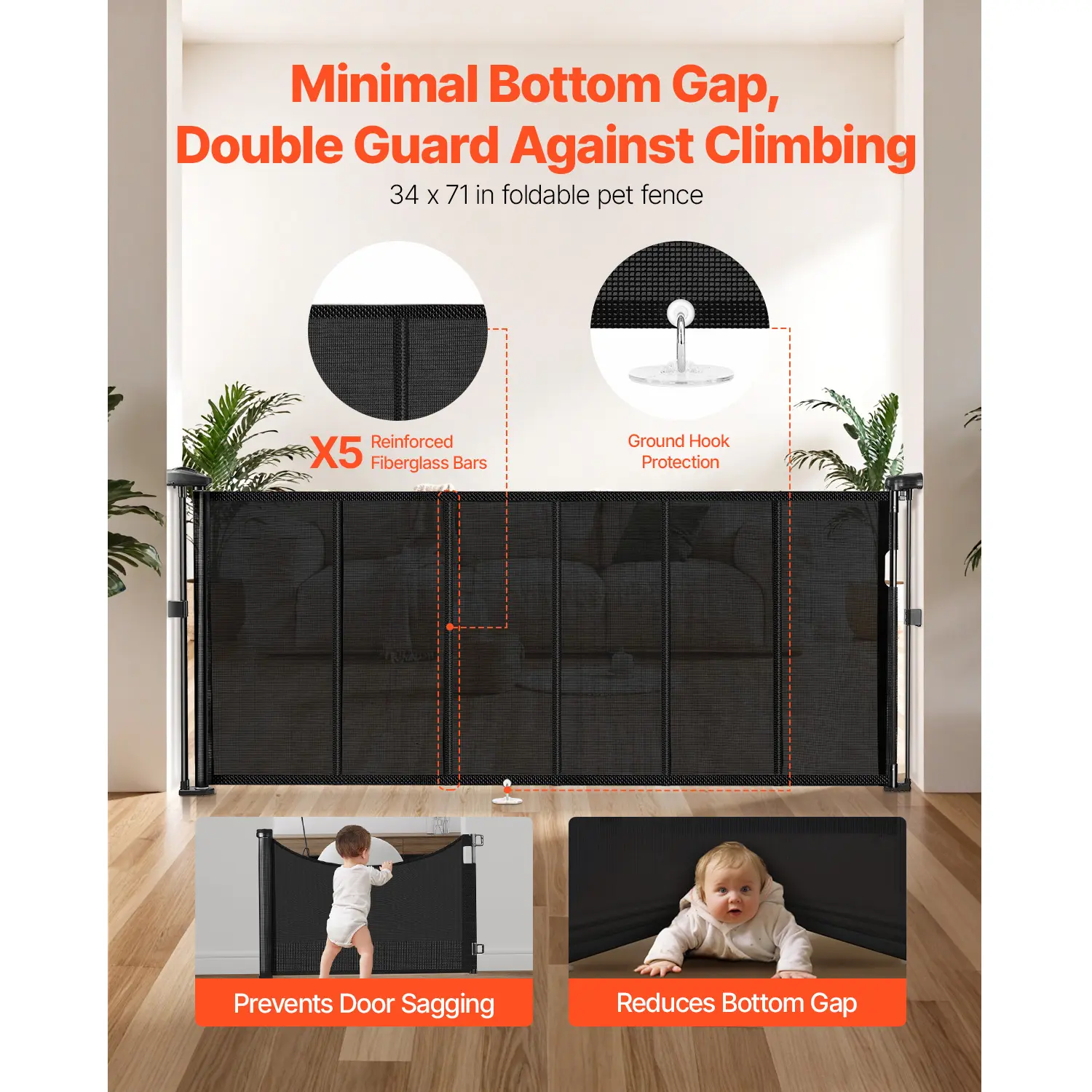 • Retractable Design: This black mesh gate can extend up to 71 inches wide, and the mesh is 34 inches tall, allowing you to adjust the opening size as needed. The retractable design makes it easy to store when not in use, taking up minimal space and keeping your home tidy and spacious