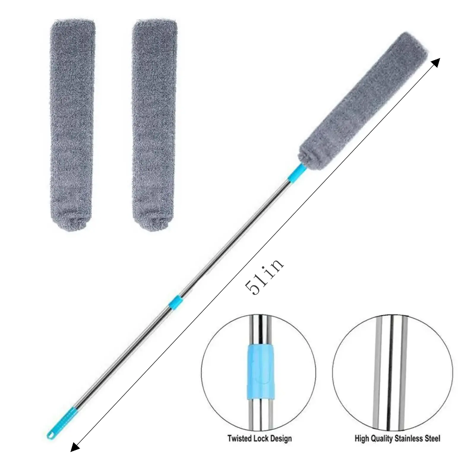 Gap Duster Cleaner Long Pole:The Length of the dust brush handle is adjustable can extend from 36" to 55", Made of stainless steel ,sturdy and durable.which accommodates different heights and cleaning tasks. Retractable gap dust cleaner are ideal for kitchens, laundry rooms and garages. size:L 55CM W 14CM H 3CM