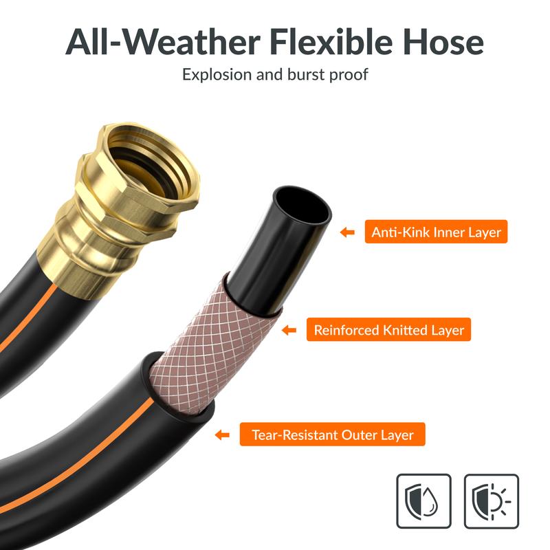 The all-weather flexible and abrasion-resistant hose guarantees leak resistance and durability. It has passed the 300PSI pressure test and the 600PSI bursting pressure test. The 82ft 1/2-inch hose is perfect for any weather.