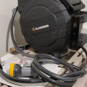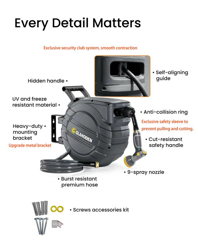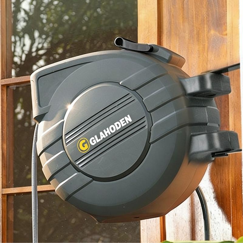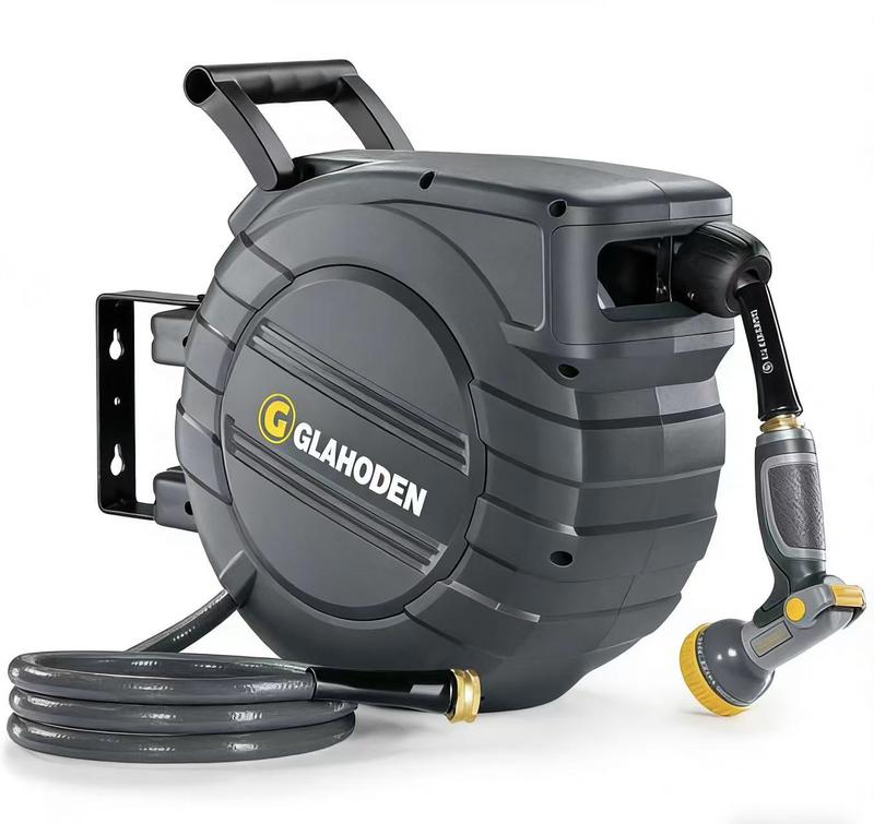·: GLAHODEN retractable hose reel boasts a patented ratchet locking system for effortless hose extension and secure locking