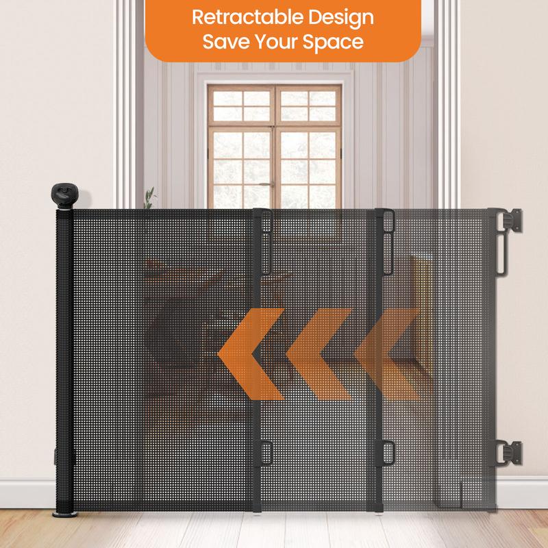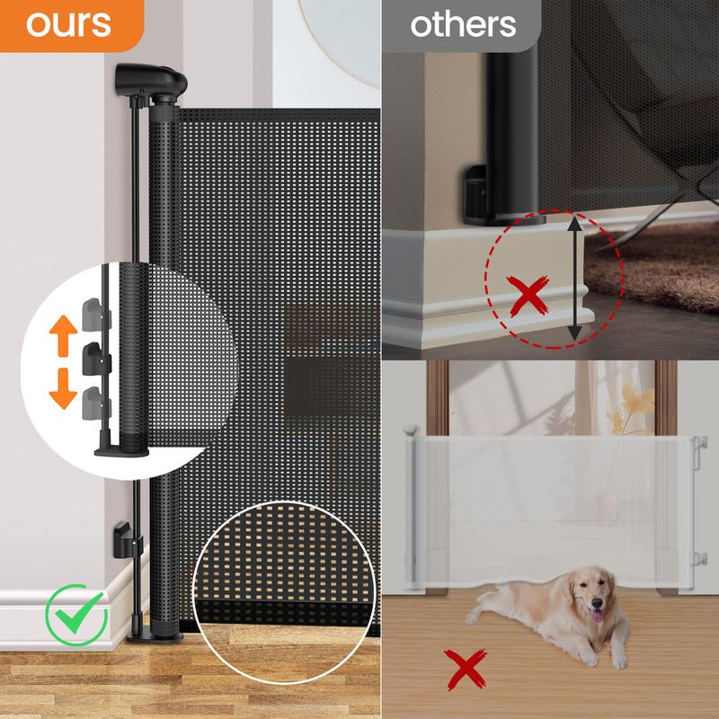 Upgrade Retractable Pet Gate: Petstars upgrade retractable gate is 33“ tall, and it extends to 55" - 118". It designed to adjust to most of door/stair/hallways. Mesh can be completely retracted away when not in use, saving your space.Unlike other gates, our upgrade retractable gate has no balustrade on the bottom - so no trip risk when you are moving through.