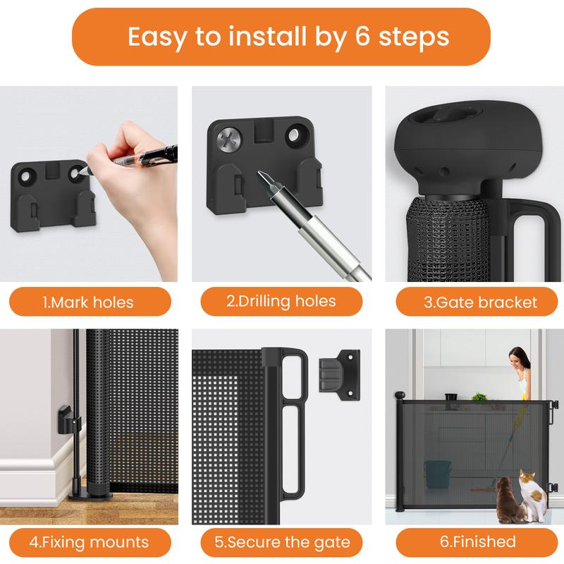 Easy to Install: Petstars Retrachable Gate is easy to install. With the tool provided help, you can have your new pet gate installed in minutes. You can watch our installation video and complete the installation in 1 minute. You will get Retractable mesh gate x1, wall anchors x2, Bracket x2, Long screws x9, Short screws x9, screw sets x9.