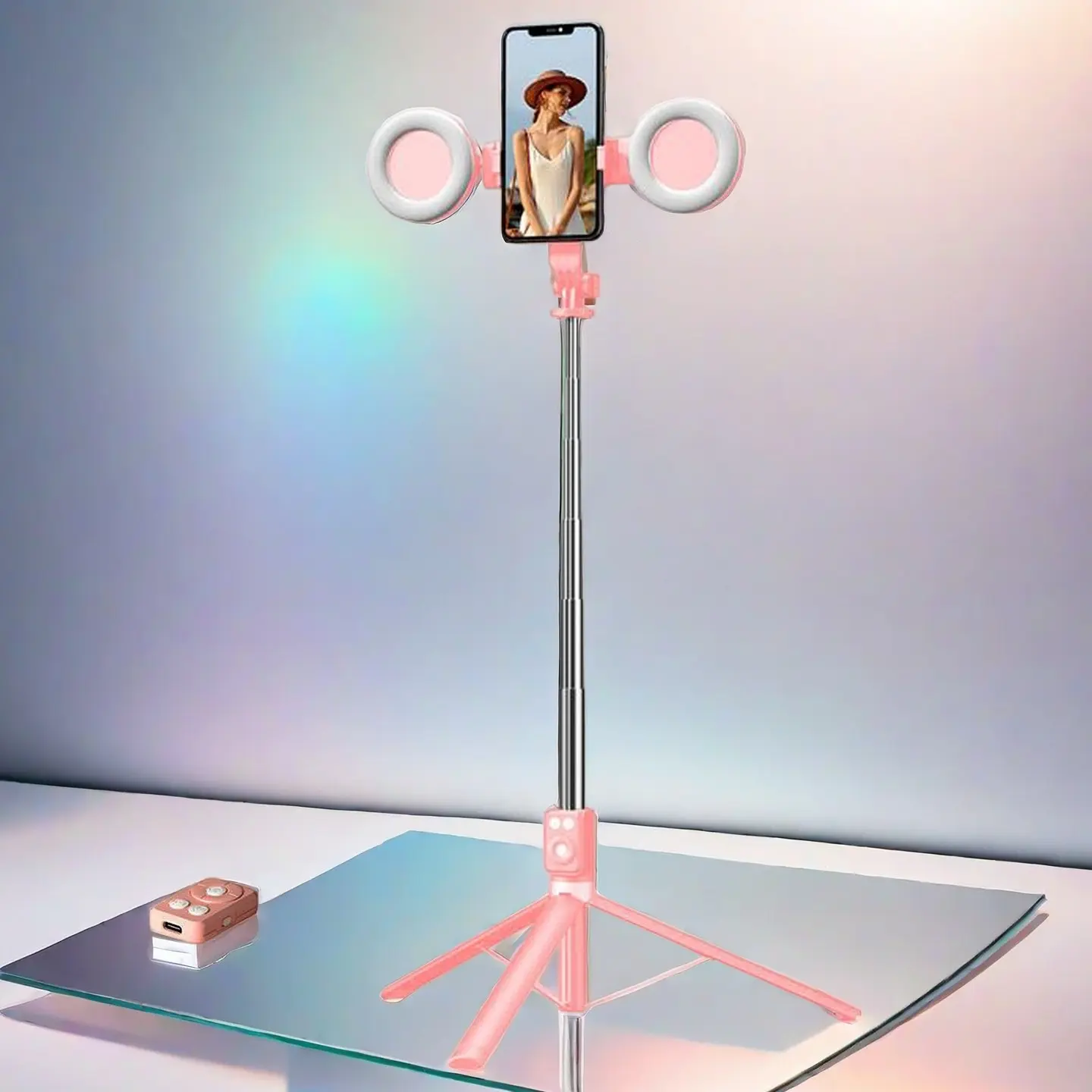 This is my favorite selfie stick it doesn’t tip over the lights are amazing. It has upped my filming content.