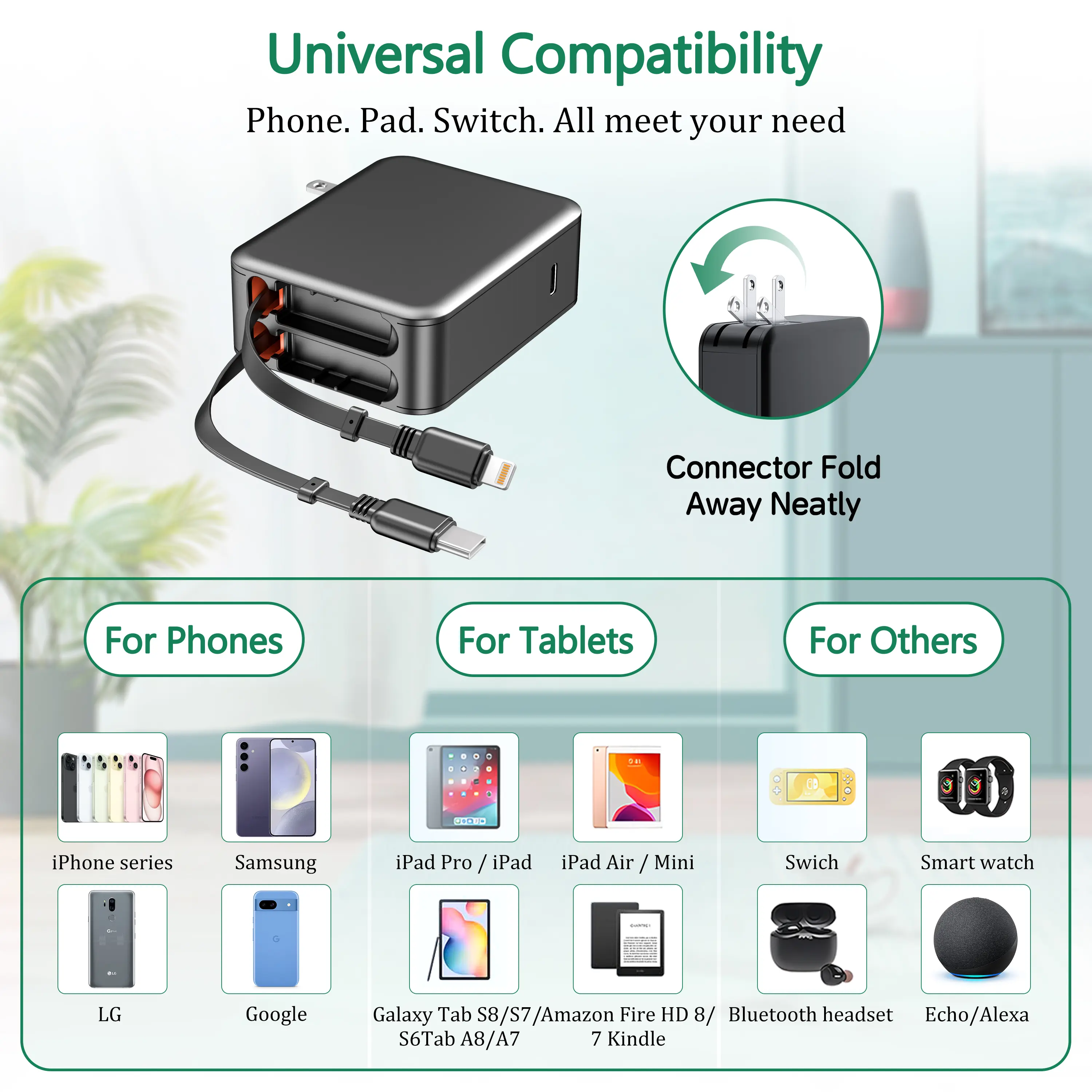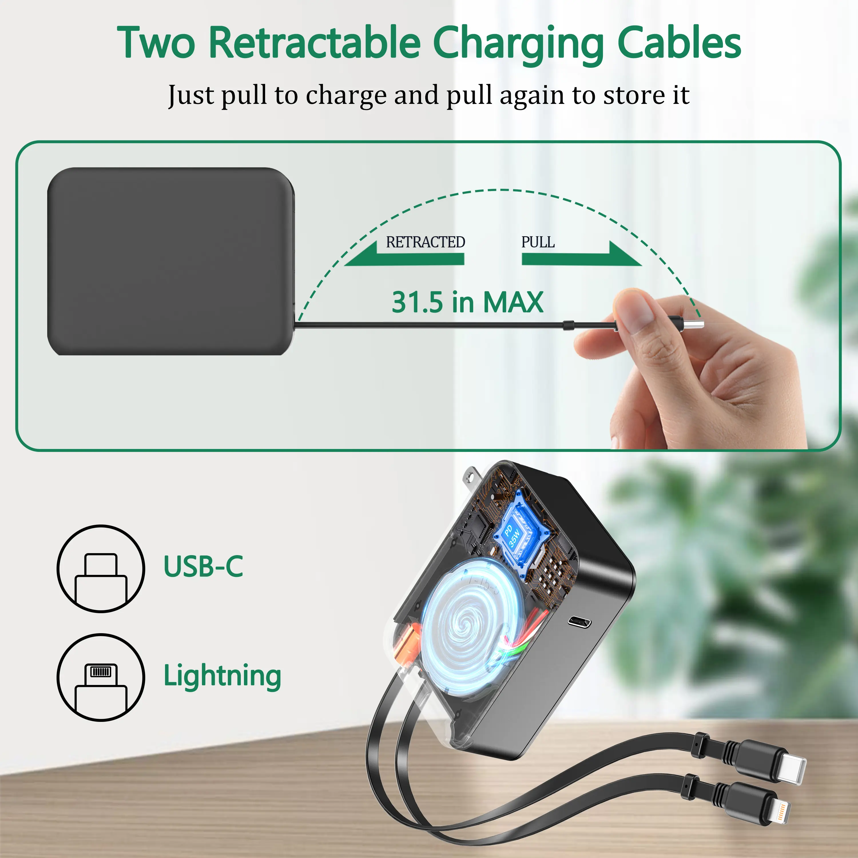 This innovative wall charger features two retractable charging cables that extend up to 31.5 inches and retract automatically for hassle-free, tangle-free storage. Whether at home, the office, or on the go, simply fold the plug, retract the cables, and slip it into your pocket or bag. (Package includes: 1 x Retractable Wall Charger)