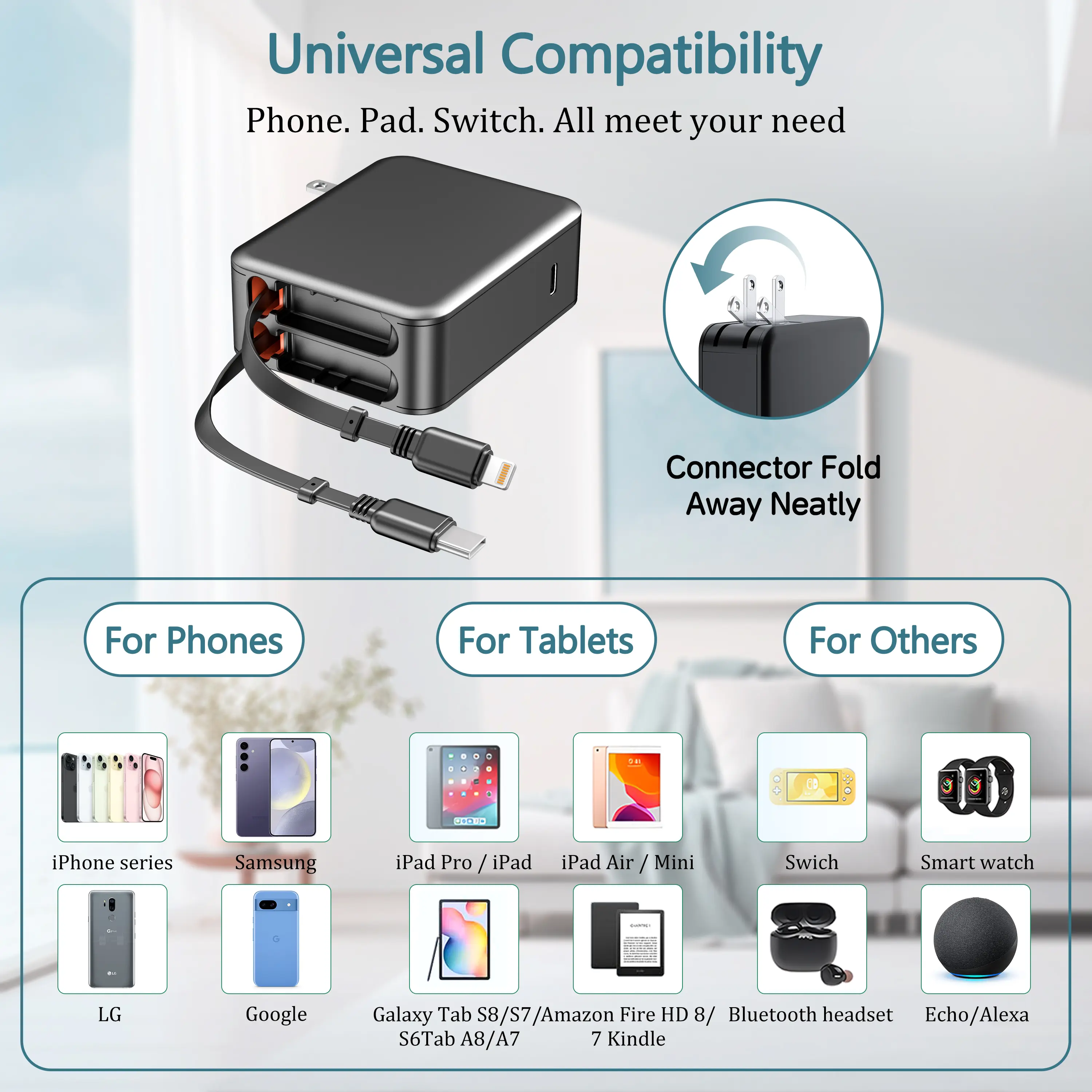 ·Foldable plug and retractable cables make it easy to store and carry in your pocket or bag, perfect for travel and daily use. Package includes: 1 x Retractable Wall Charger.