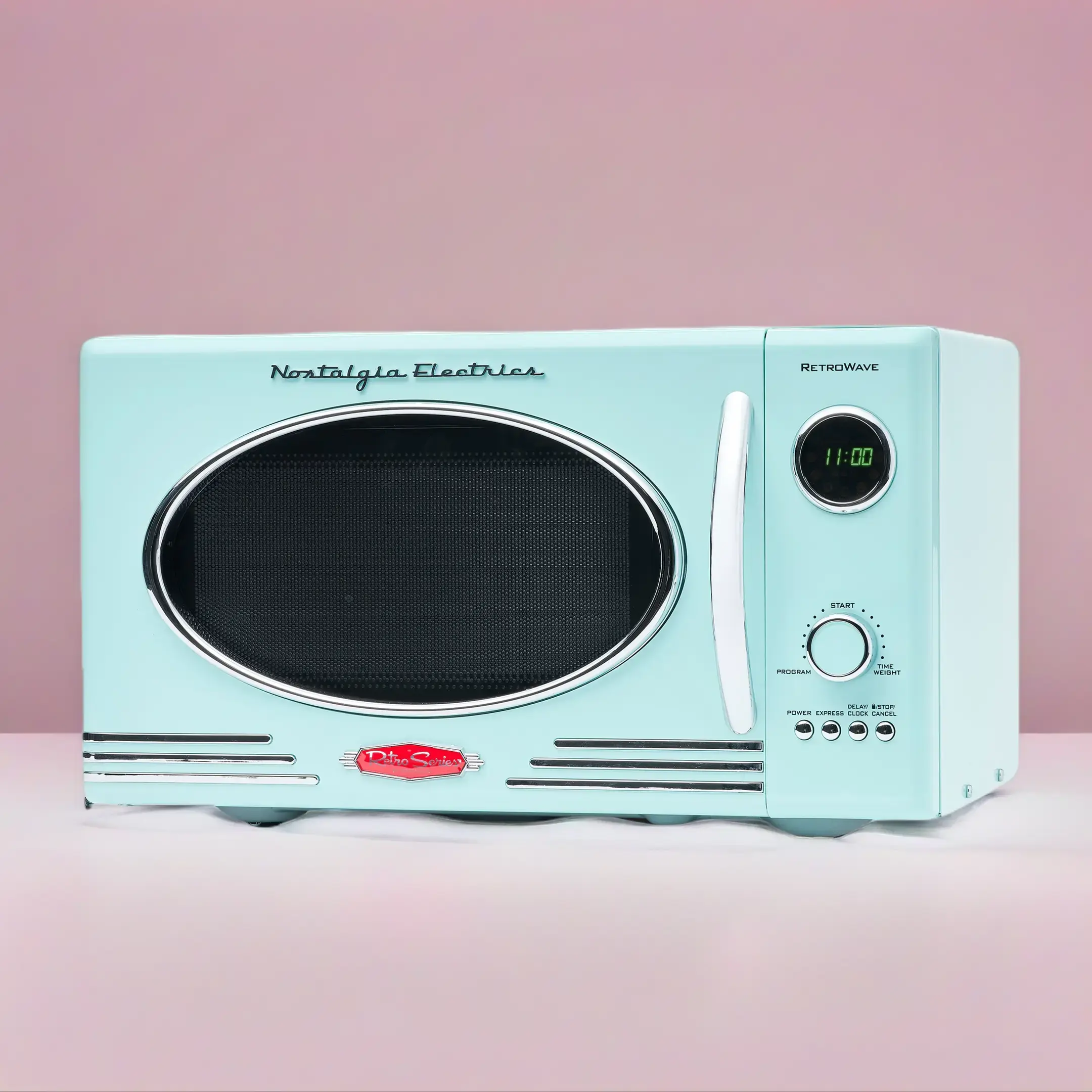 ·Sleek Chrome Door Handle: Adds fun and flair to this unique retro-styled appliance. Control panel and accents complement the design.