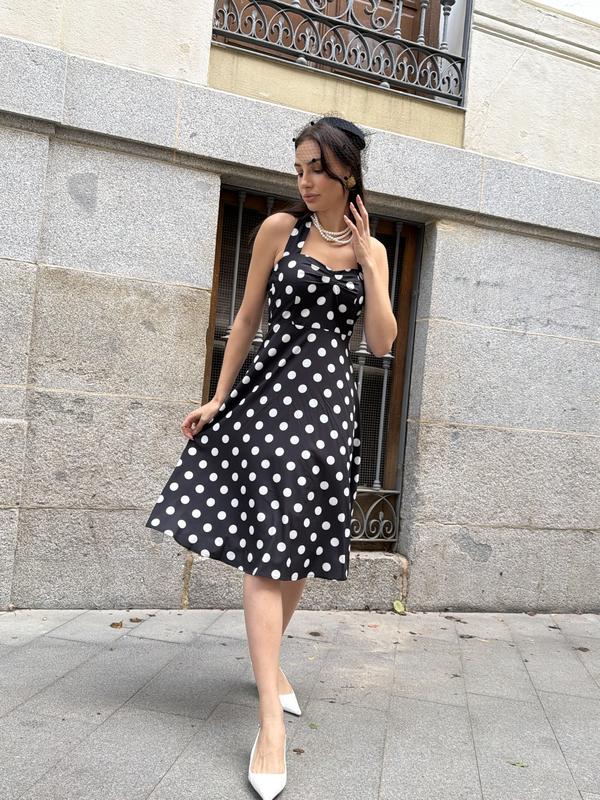 Retro Stage 1950s Vintage Polka Dot Halter Dress for Women A-line Silhouette valentine's Day with Bow Detail & Flared Skirt Casual Everyday Wear