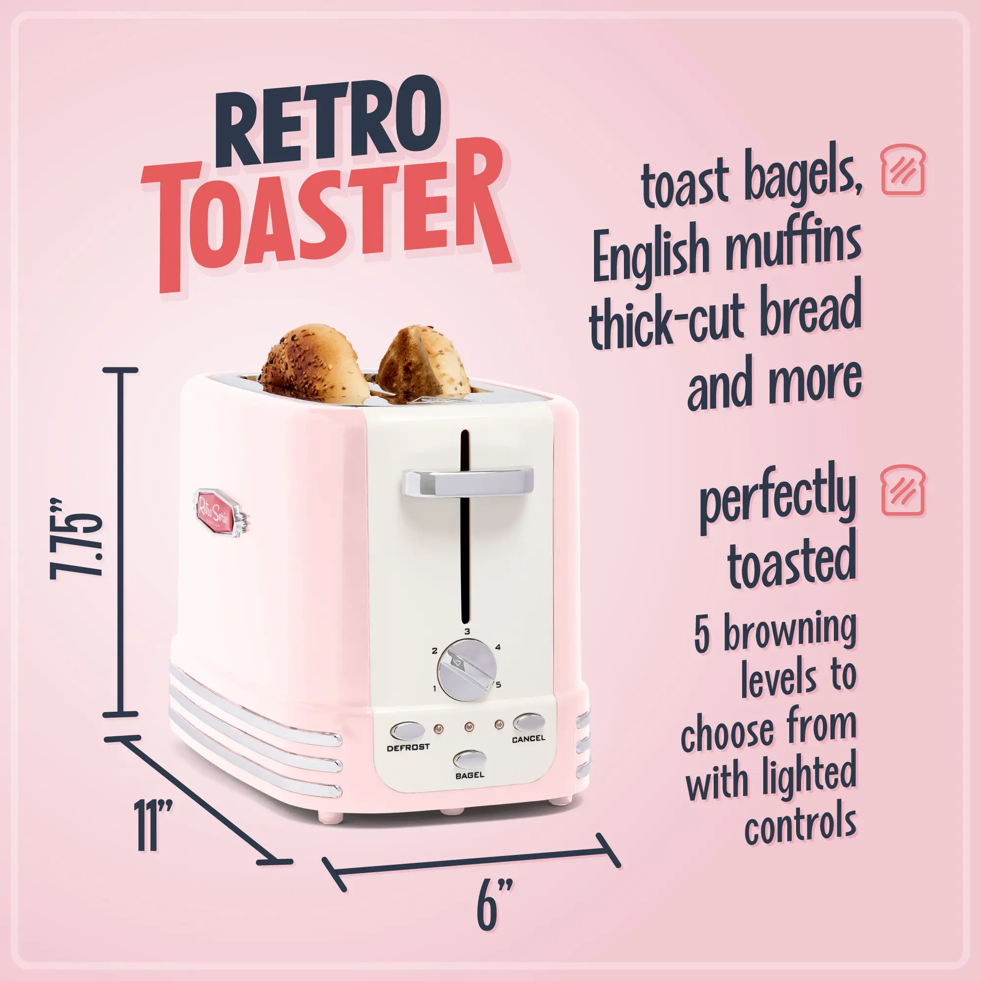 Lighted control buttons offer bagel, defrost, and cancel options. This feature allows you to easily select the settings you need for your toasting needs.