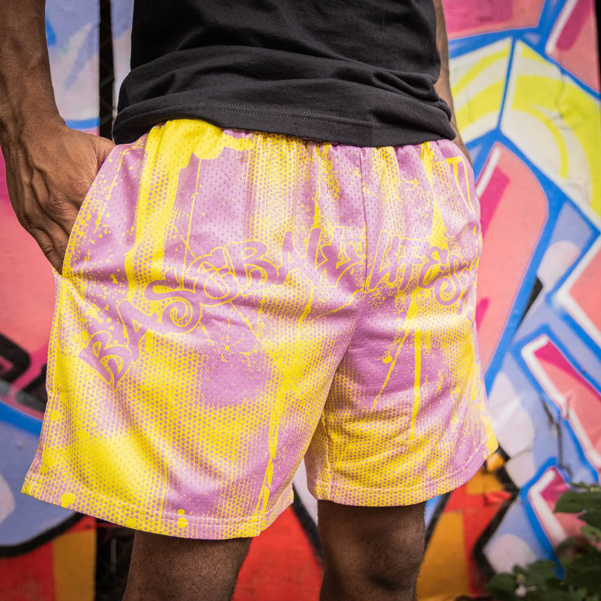 Turn heads from the dugout to the drop zone with the Retro Graffiti Shorts - Pink/Yellow. These vibrant mesh shorts mash up street energy with ballplayer swagger. Featuring an electric pink and yellow graffiti-style splatter across a breathable athletic mesh, this pair brings heat like a fastball up and in.