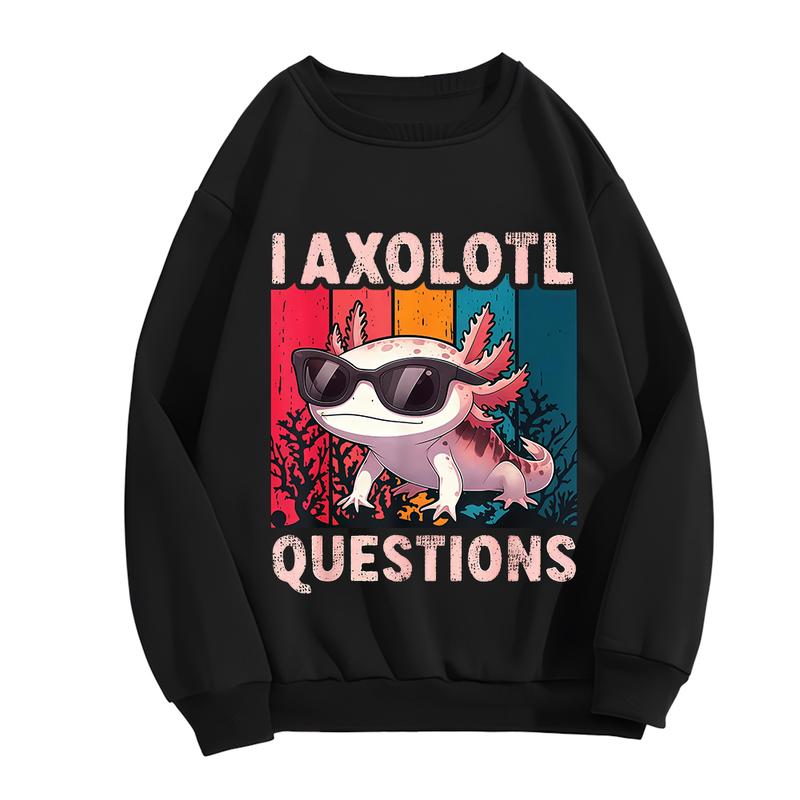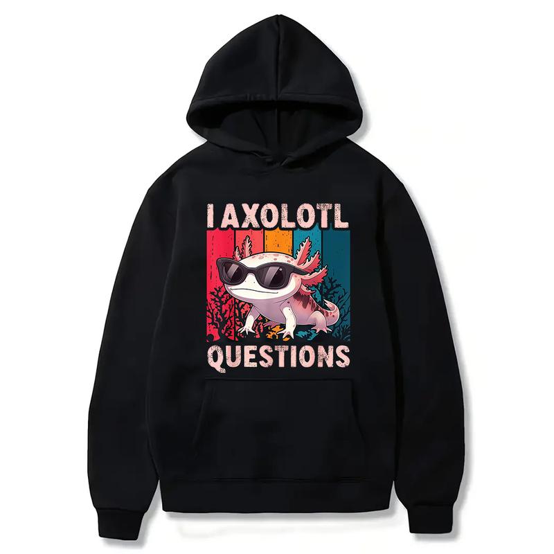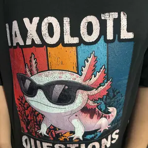 ·Design: The t-shirt features a graphic design of an axolotl wearing sunglasses with the text "I Axolotl Questions" in bold, colorful letters.