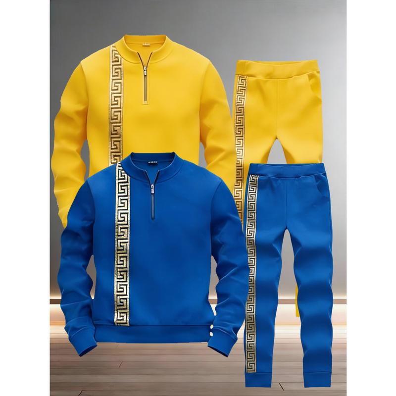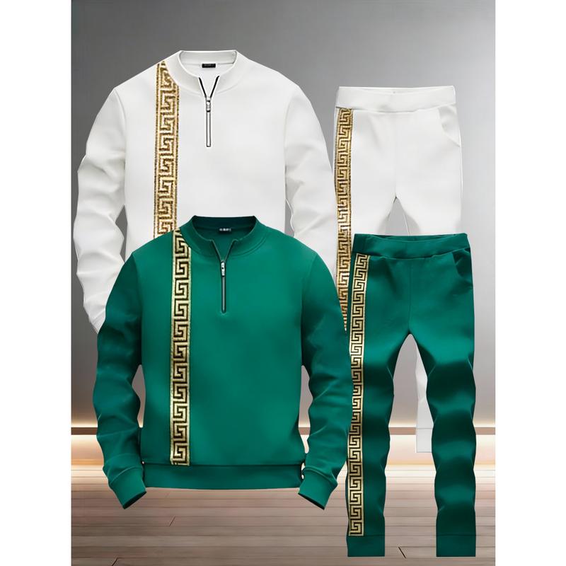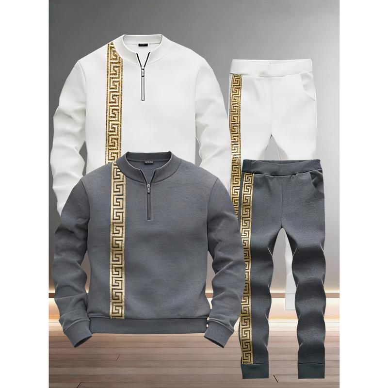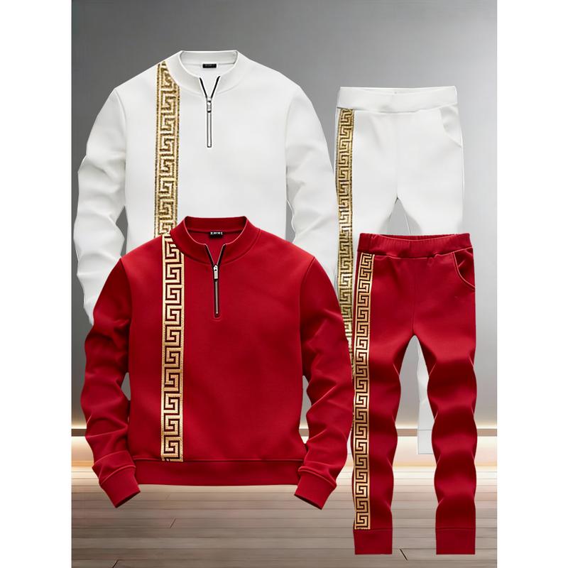 Retro Greek Key Accent Men's Tracksuit - Half-Zip Stand Collar 2-Piece Activewear (Multi-Color)