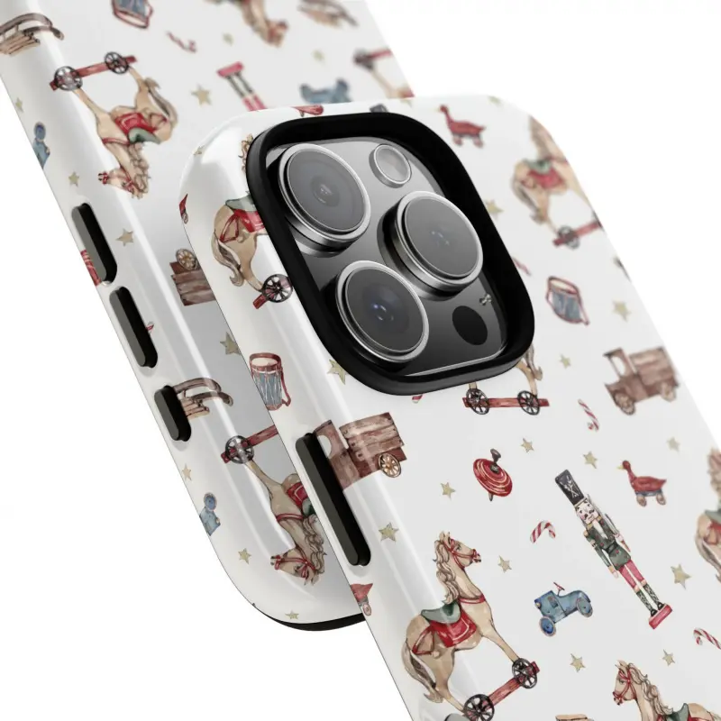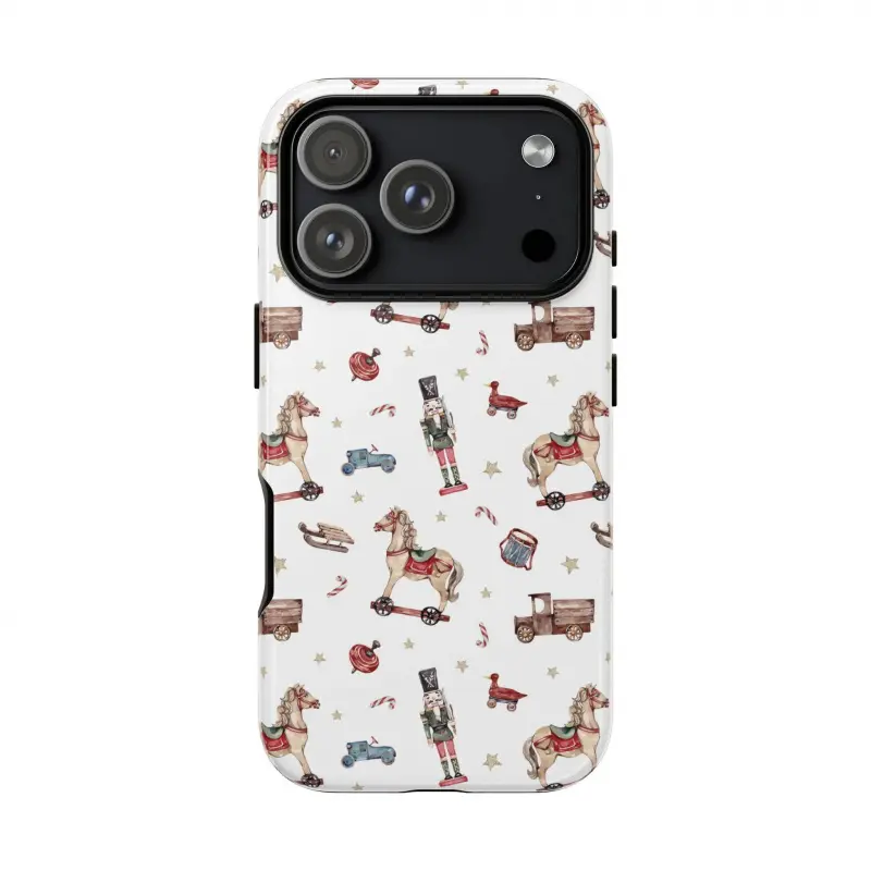 This retro nutcracker case features a fun, childlike market design. It's durable, shock-absorbing, and has a glossy finish. Compatible with iPhone 17, 16, 15, 14, 13, 12, 11, X, and Samsung models. Makes a great holiday gift for friends or family.