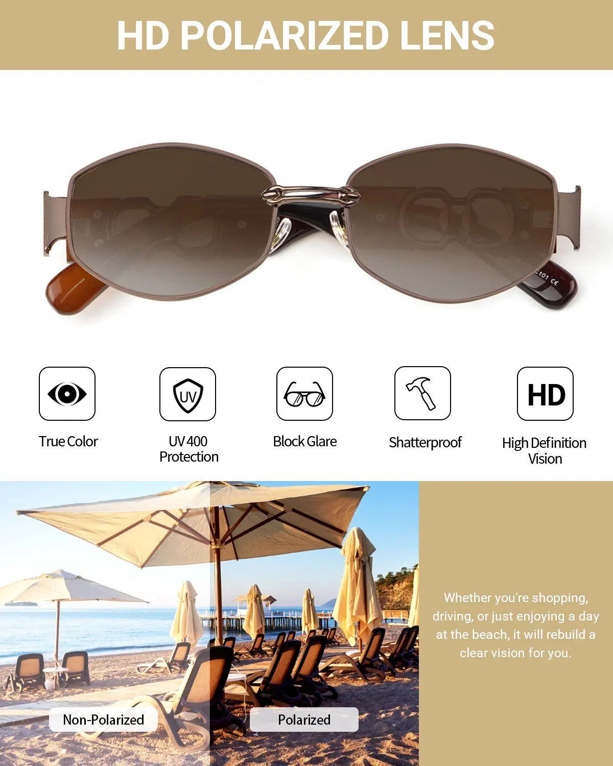 ·Gradient Brown Polarized Lenses: The gradient brown polarized lenses add a unique and trendy element, enhancing the overall aesthetic appeal.