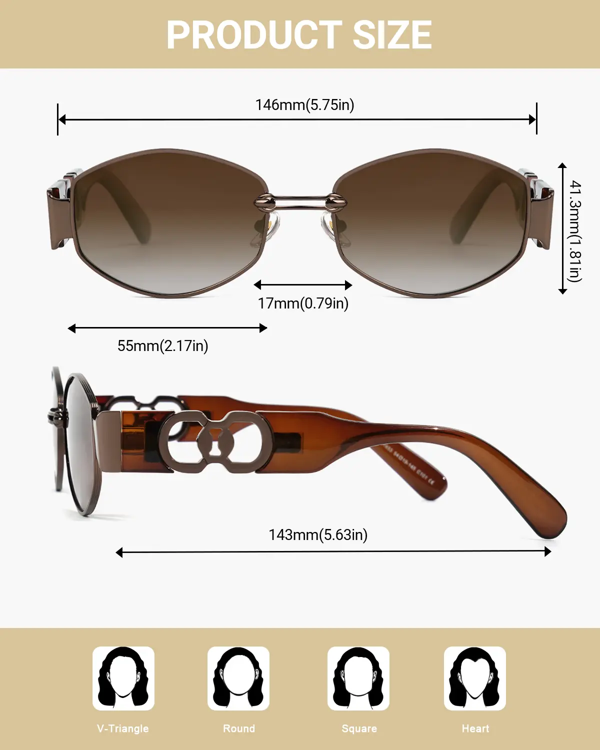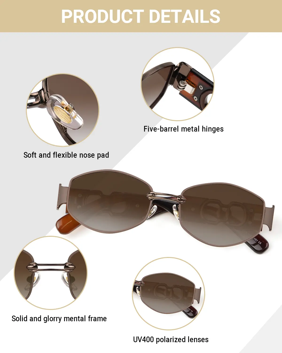·Brown Metal Frame: The brown metal frame complements the golden metal frame, creating a cohesive and fashionable appearance.
