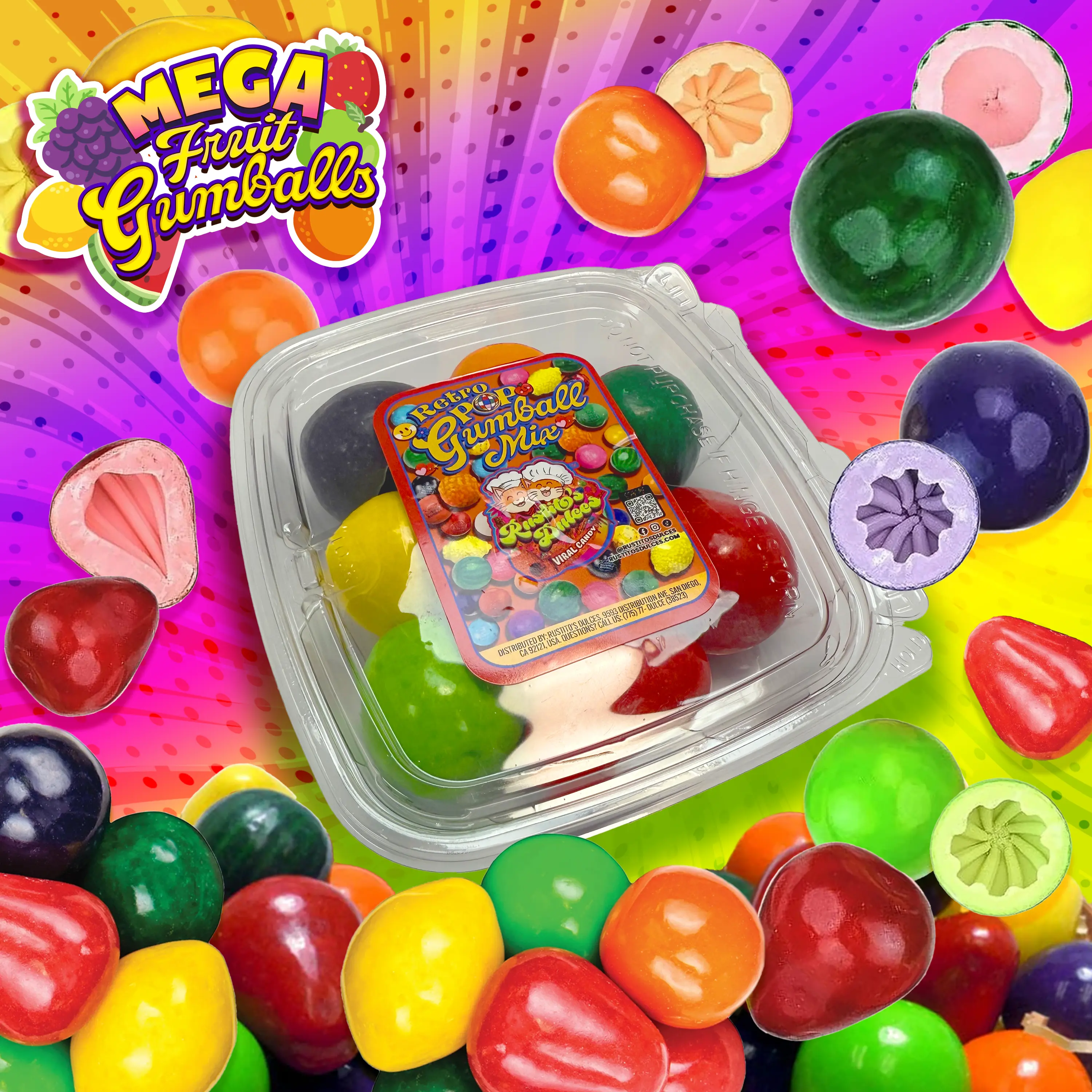 Mega Fruits - A mix of Jumbo Mega Fruit gumballs combined with small watermelon gumballs when available.