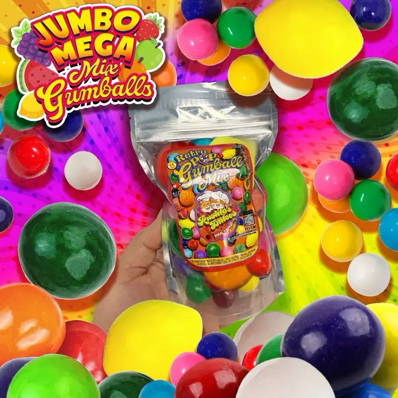 Jumbo Mega Mix - A large variety mix featuring Jumbo Mega Fruits plus Jumbo Mega Mouth and additional gumballs in assorted sizes, colors, and flavors. The Mega Mix is the most diverse size-and-flavor assortment.