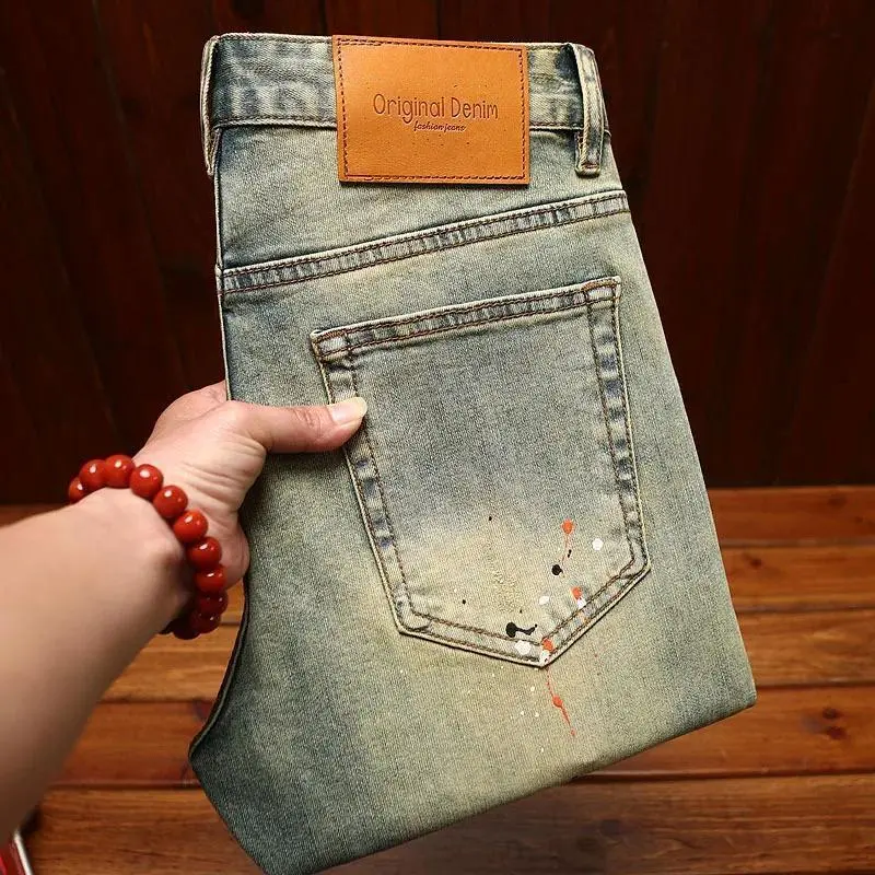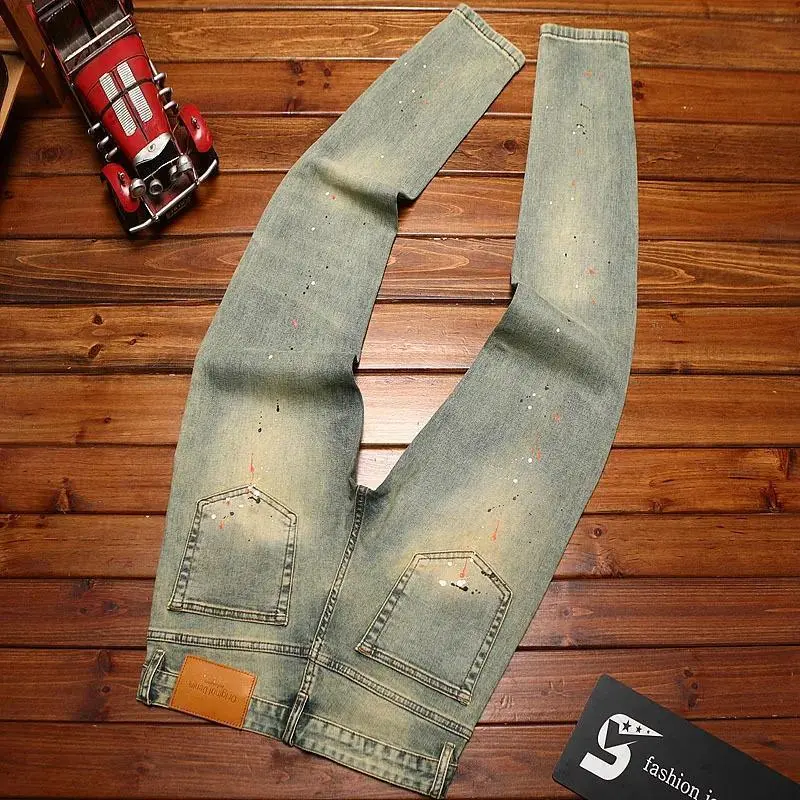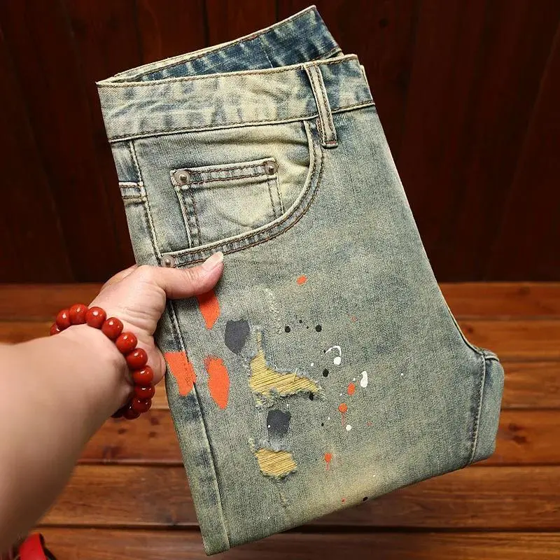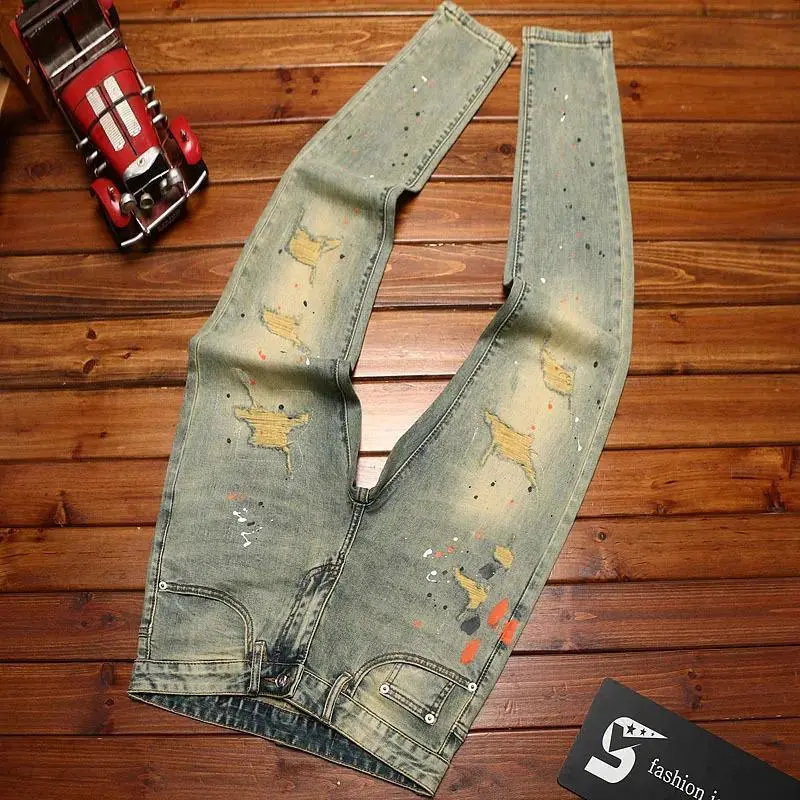 5. Retro ripped jeans for men, slim fit with small feet, trendy paint printing, Street Fashion Design, vintage denim pants