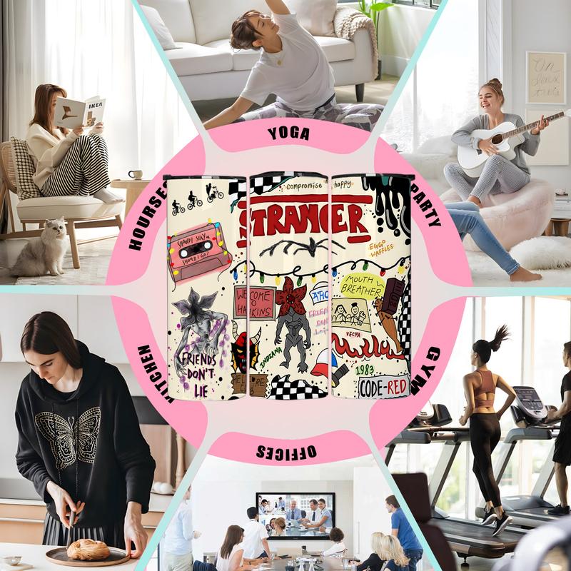 1 Pc 20oz Skinny Vacuum Cup, Tumbler, Insulated Travel Drinkware, Retro 80s sci fi doodle collage, cassette tape, monster art, double wall steel, leak proof lid, keeps hot 12 hours, cold 24 hours, for hot cold drinks, movie fan gift, gift for friends