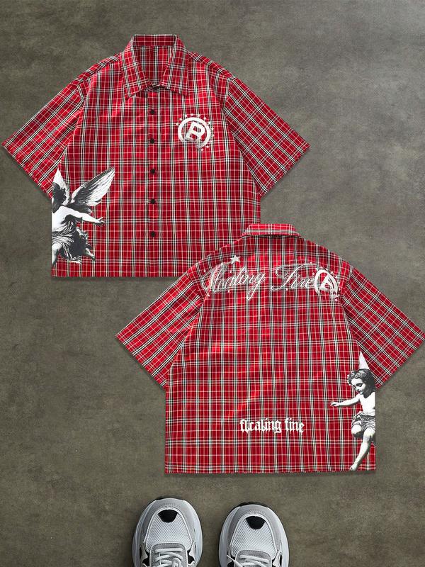 Retro Striped Short Sleeve Shirt with Letter Print, Loose-Fitting Casual Woven Top for All Seasons, Vintage Style Button Shirt, Casual Comfy Shirt