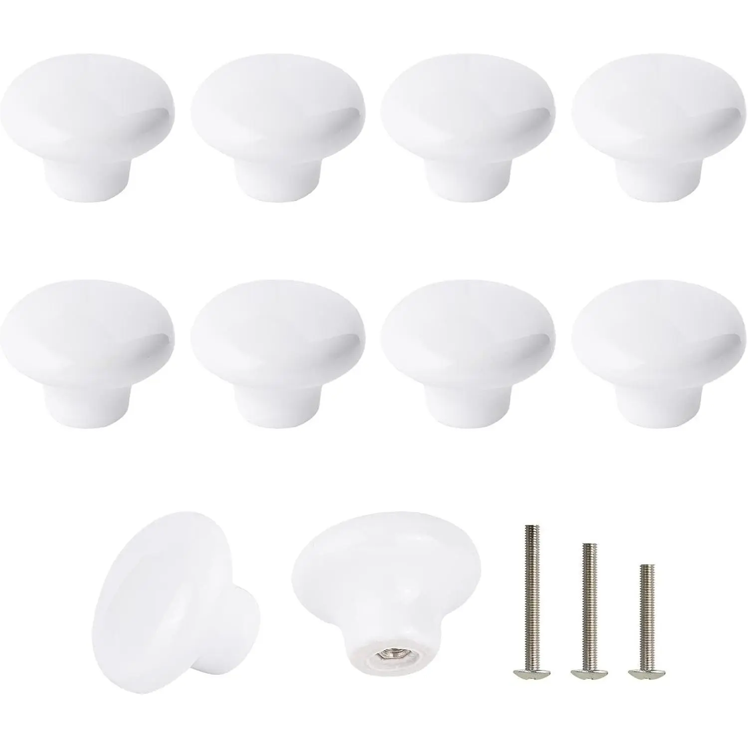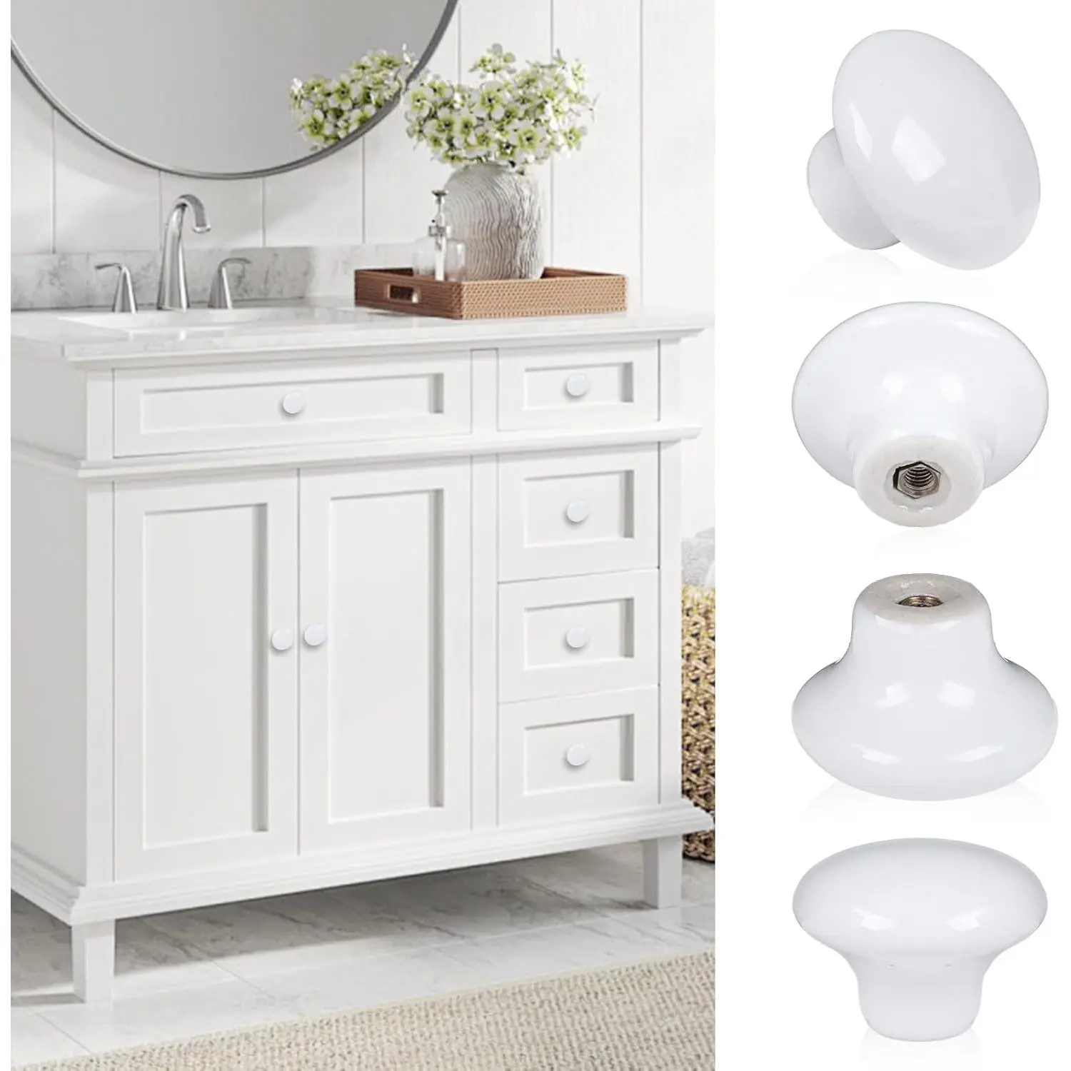 Set of 4 count simple and delicate round door knobs pull handles, which are made of durable hard ceramic material, and can be for cabinet, drawer, bin, chest of drawers, wardrobe, etc.