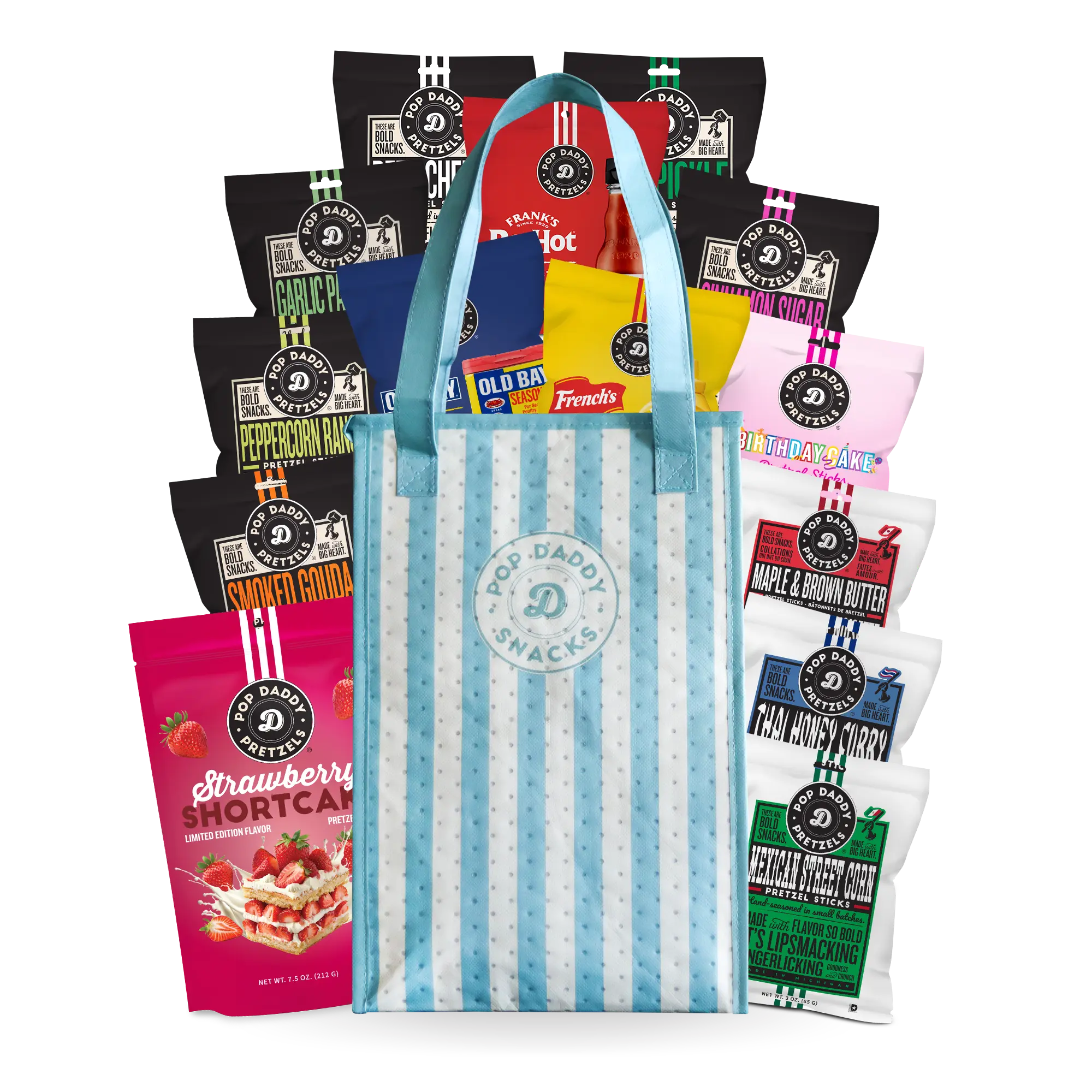 Love this bundle! I'm obsessed with pop daddy pretzels and my local grocery store only carries a couple of flavors so I was super excited when I saw this bundle. The freezer bag is so cute, great for carrying a few alcohol beverages to a friends house lol.