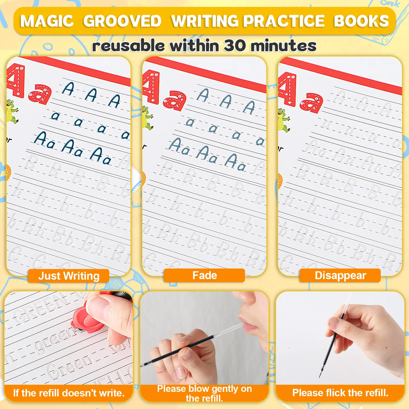 [Magic Ink]:Reusable Grooved Handwriting Workbooks use magic ink, it disappears after twenty minutes,and feature extra-thick hardboard pages, allowing you to reuse the books as many times as you would like.