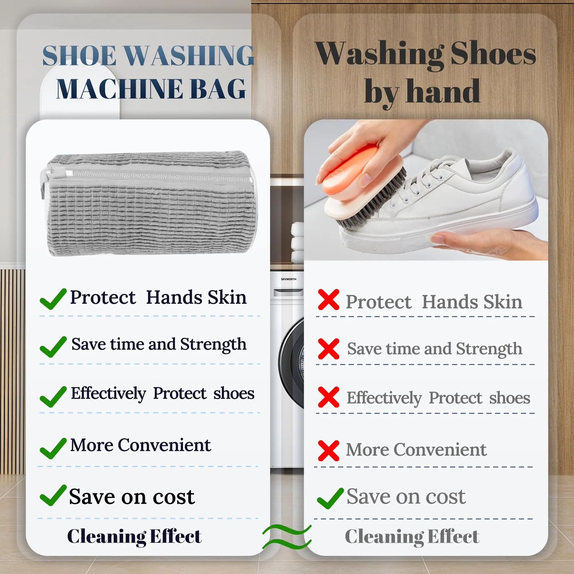 Easy to Use,Save Time and Strength: our shoes washing machine bag is designed to be easy use,place shoes inside washing bag,pull up zipper and put zipper head behind or under protection cover, toss it in washer for washing.Then the shoe laundry bag will do the rest and you don’t need to do hand scrubbing for tens of minutes.This laundry shoe bag for washer and dryer is of great value to save your time and strength.