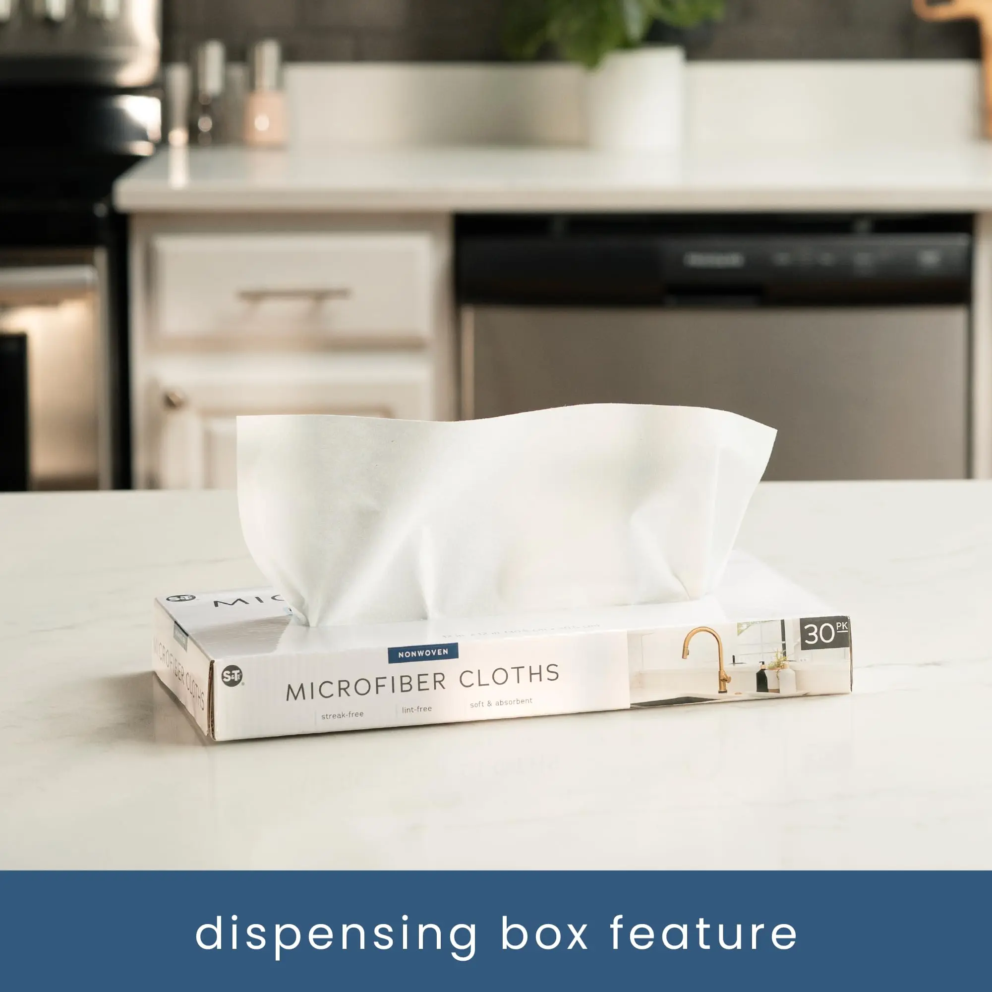 ·One 30 pack of S&T INC. Non-Woven Microfiber Cloths measuring 12 inches by 12 inches each; white rags for cleaning house are the perfect kitchen cleaner, or add to your car cleaning kit