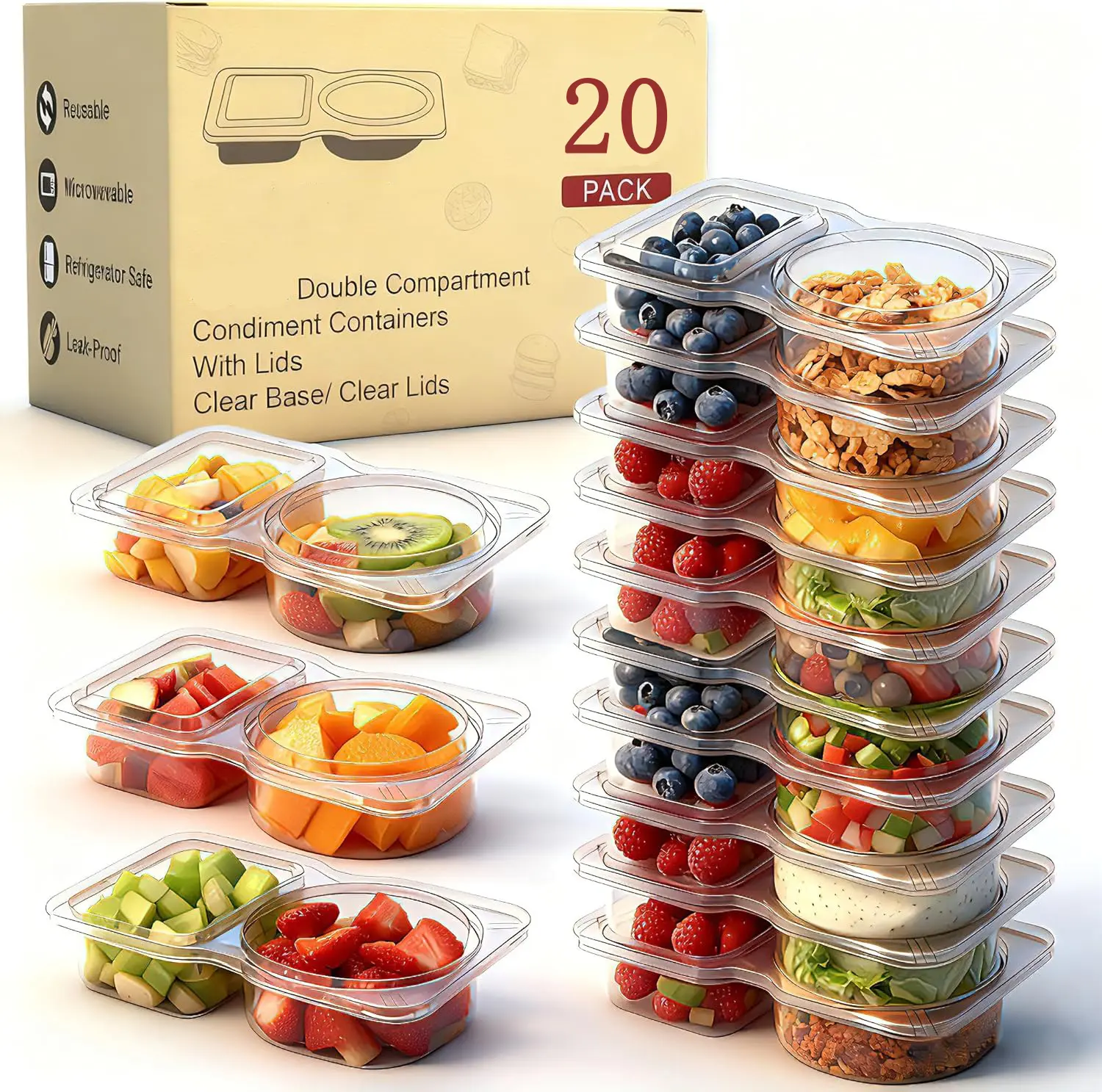 PORTABLE & LEAK-RESISTANT: The secure lids help prevent spills, making these double-compartment containers great for travel, picnics, and camping. Enjoy your snacks anywhere!