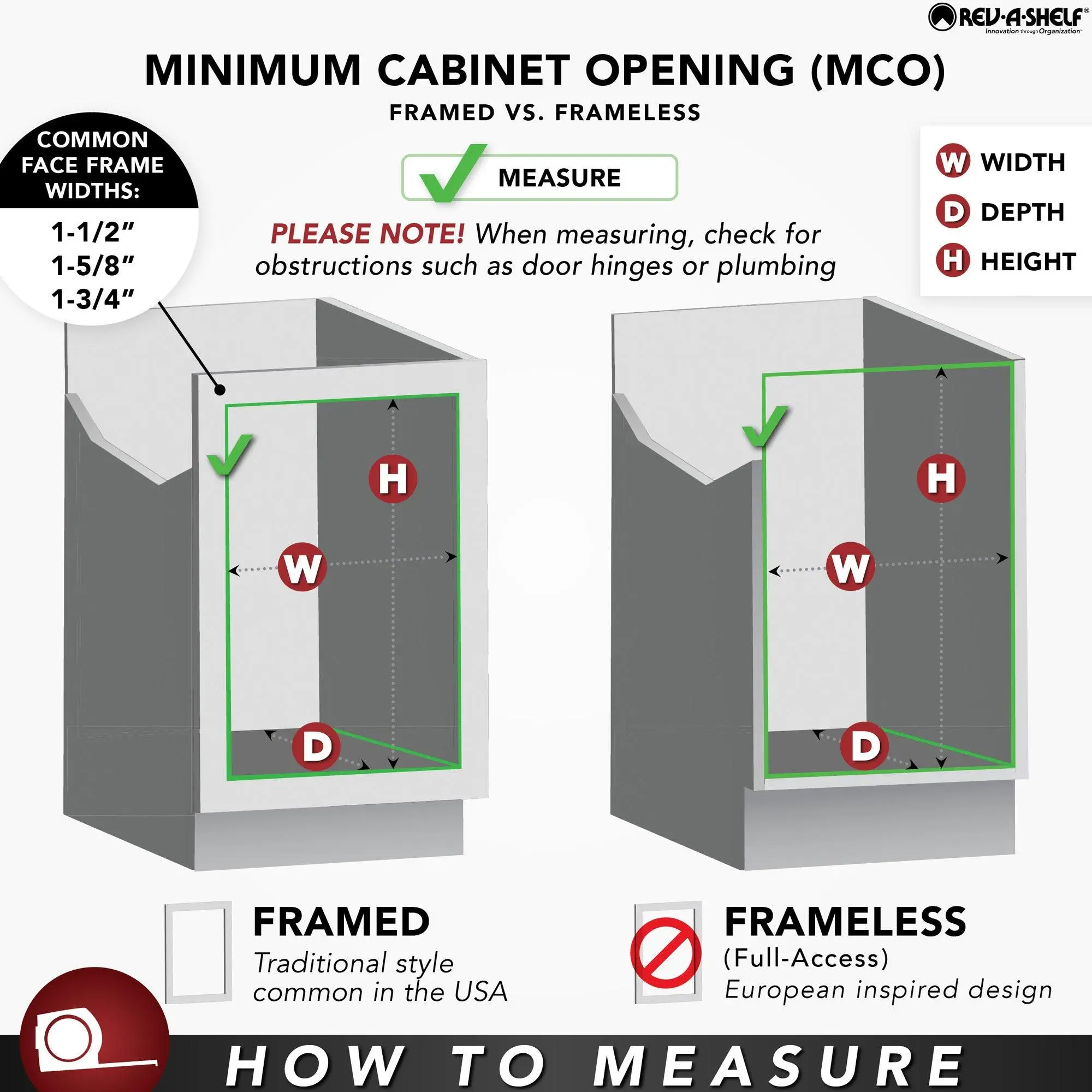 Designed for a base 15" cabinet; minimum cabinet opening for a face frame/frameless cabinet is 11.75"W x 22.5"D x 5.75"H