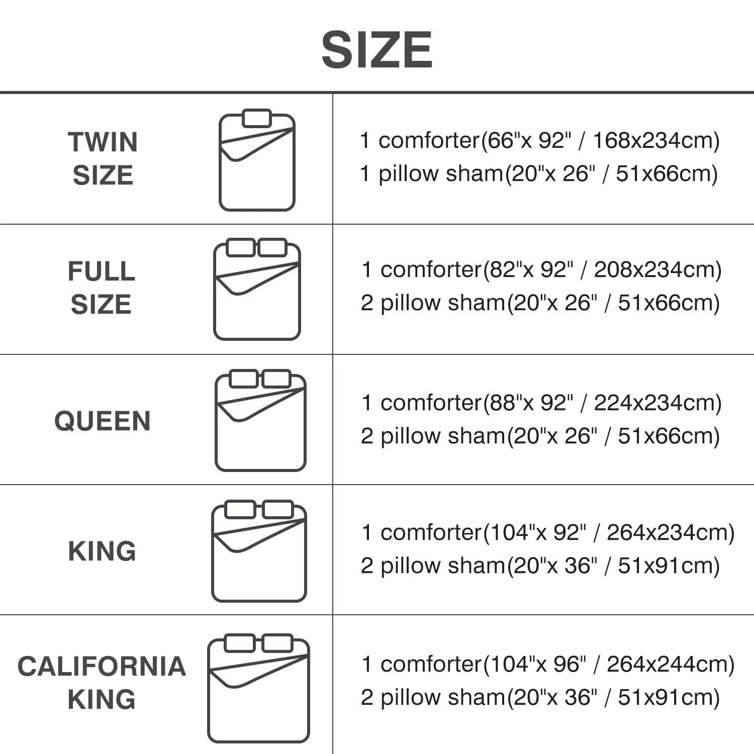 Sizes Available 📏- California King: 1 Comforter (104" x 96"), 2 Pillow Shams (20" x 36")- King: 1 Comforter (104" x 92"), 2 Pillow Shams (20" x 36")- Queen: 1 Comforter (88" x 92"), 2 Pillow Shams (20" x 26")- Full: 1 Comforter (82" x 92"), 2 Pillow Shams (20" x 26")- Twin: 1 Comforter (66" x 92"), 1 Pillow Sham (20" x 26")