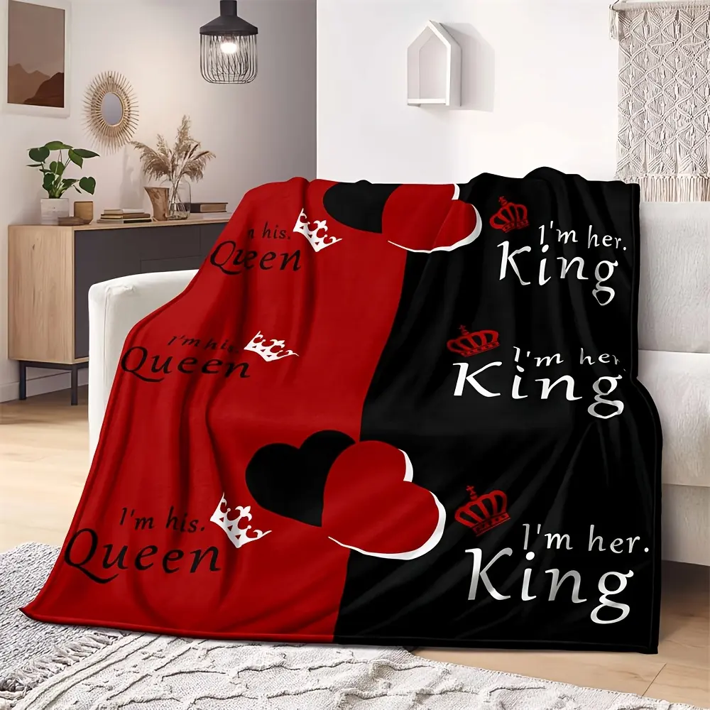 Reversible King and Queen Flannel Blanket, Soft All-Season Knitted Polyester Bedding, Machine Washable with Appliqué, Perfect for Camping, Travel, and Valentine's Day Gift,blanket plushthin quilt holiday gift
