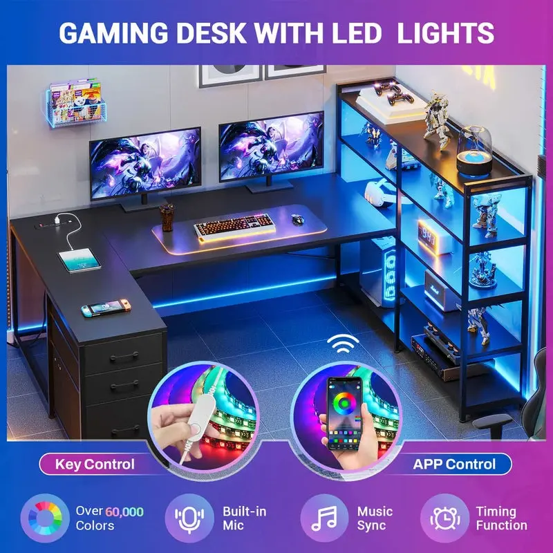 ·L-Shaped Gaming Desk with Multi-Functional Design: This L-shaped gaming desk features a built-in power outlet, RGB LED lights, storage shelves, fabric drawers, and a CPU stand. The spacious desktop can hold two monitors, making it suitable for two desktop computers and one laptop. Its space-saving corner design makes it an excellent choice for gaming or creating a productive home office in small rooms.