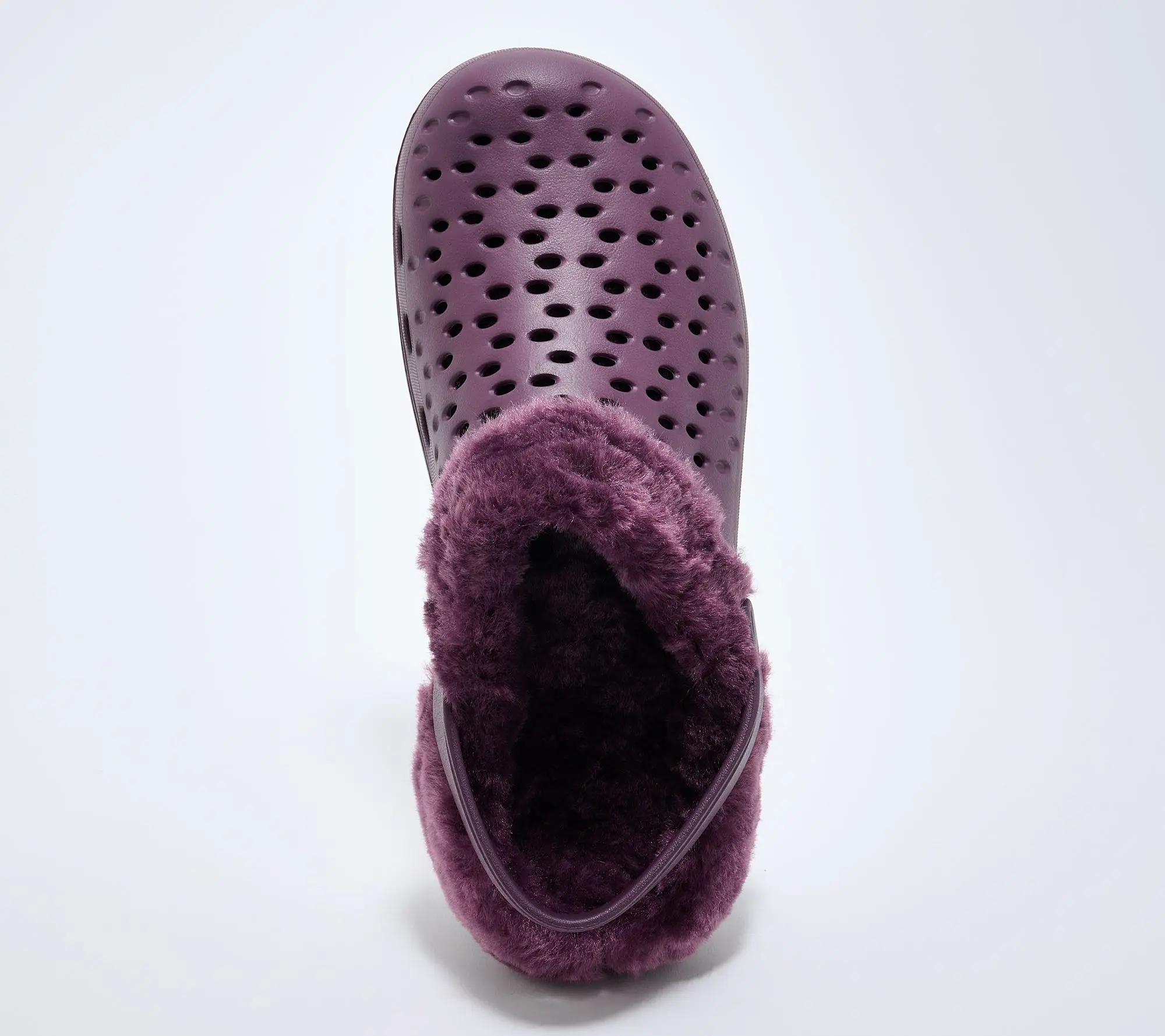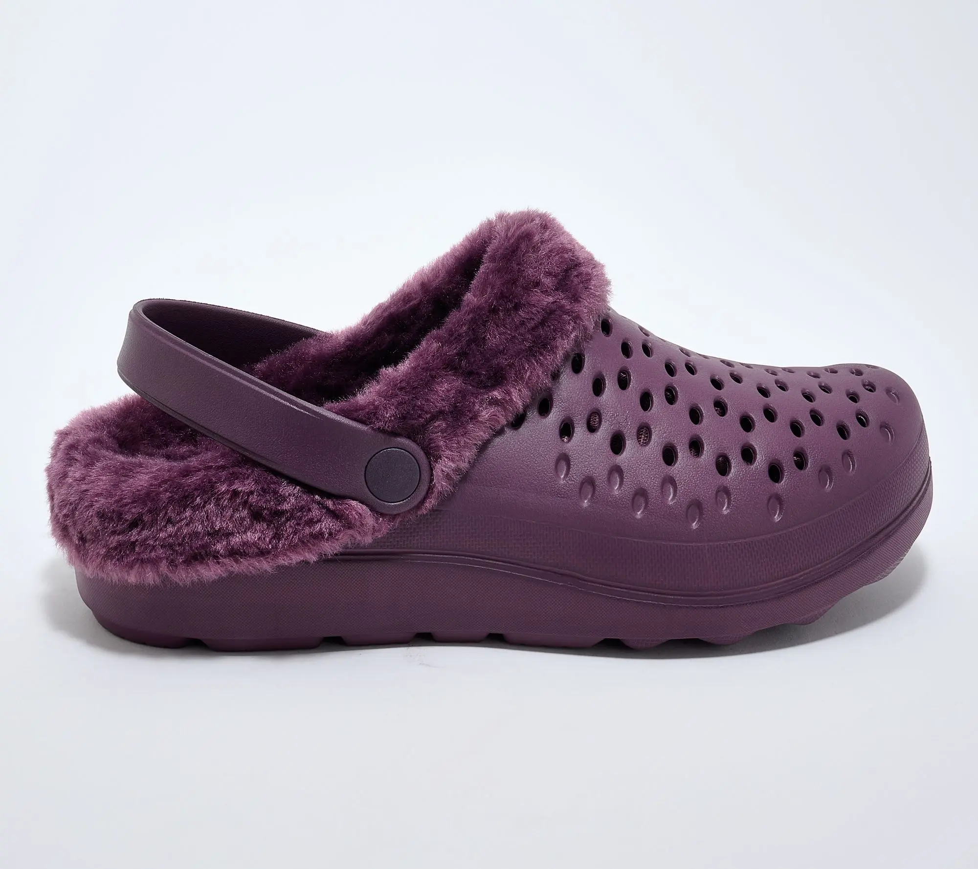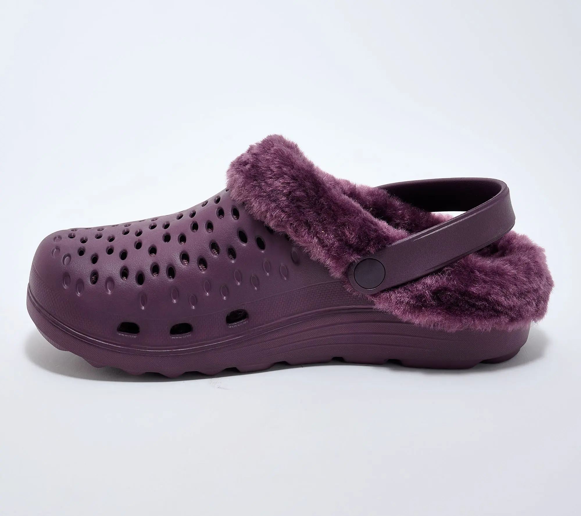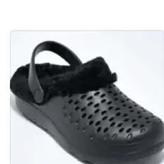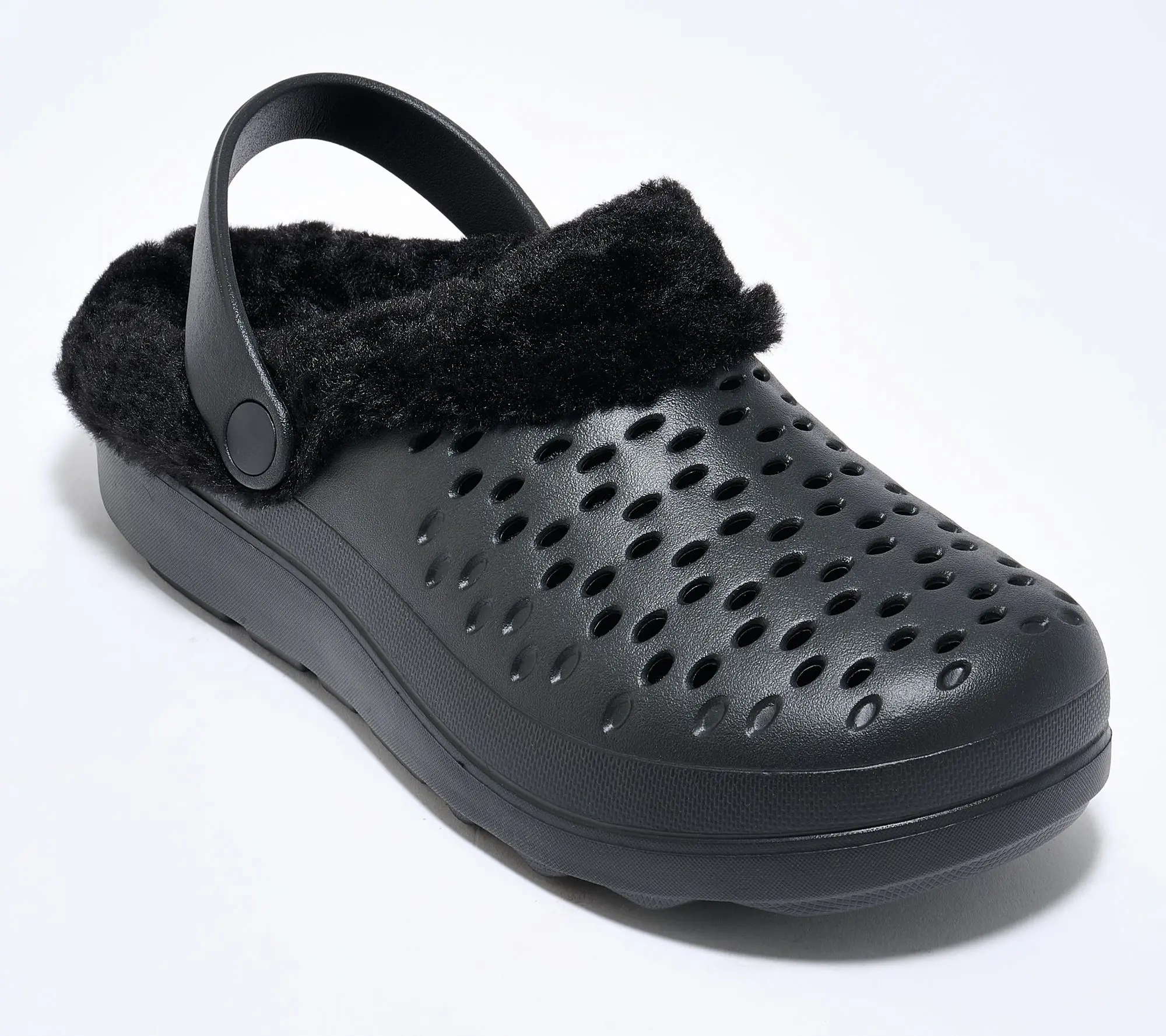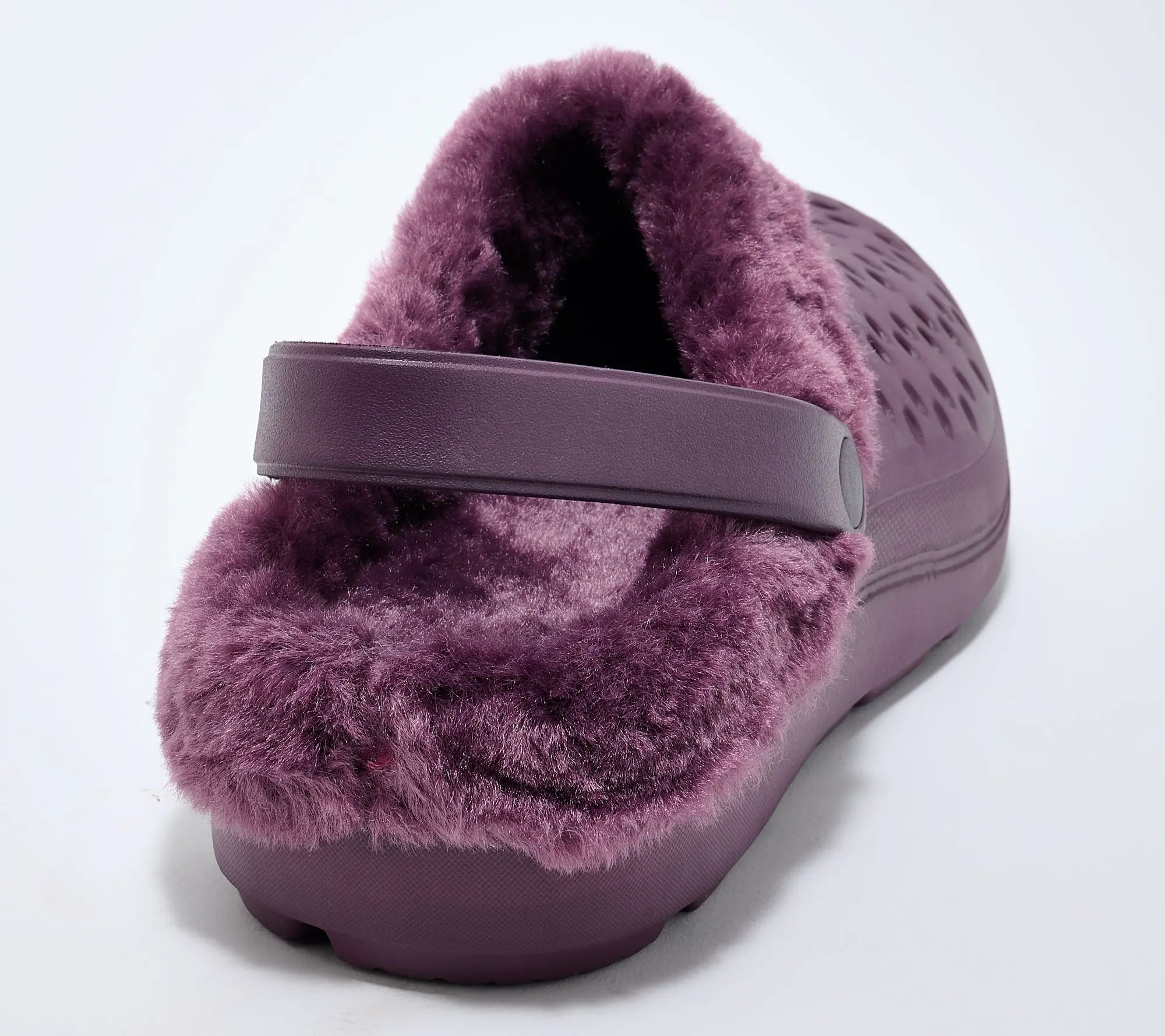 ·Perforated EVA upper, tonal faux fur collar and lining, adjustable pivoting strap with stretch