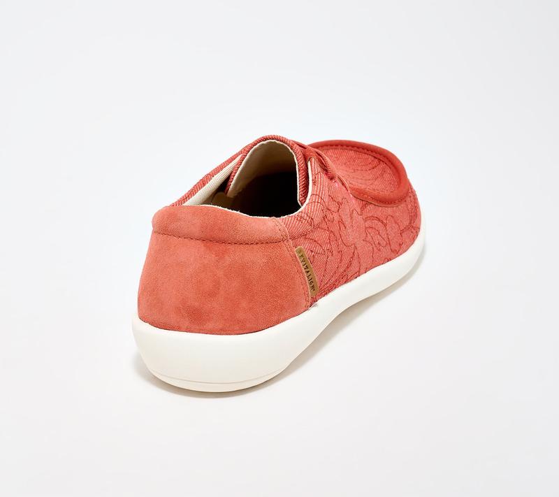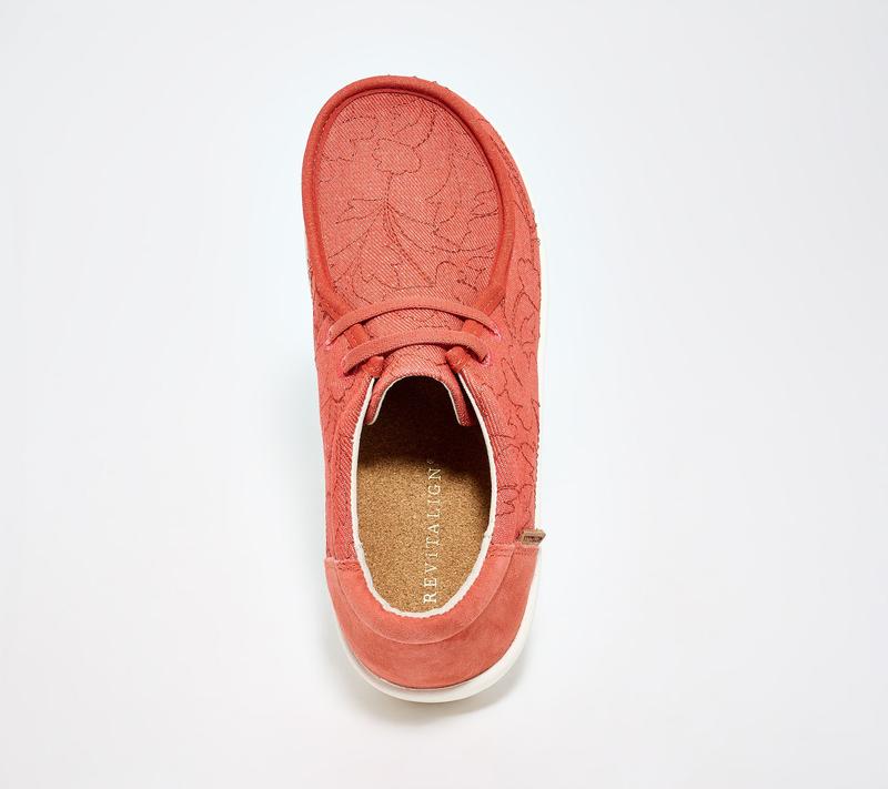 Revitalign Orthotic Embroidered Slip-Ons - Carefree Tuscany Slip-on and go style with deco-stitched pattern on denim canvas. Genuine leather in the heel, stretch laces and memory foam footbed for comfort. CLASSIC outsole gives orthotic and metatarsal support. Heel Height: 5/8 in. Sole Thickness: 1/4 in. COO: Imported. Fits True to Size. Content: Leather/Textile Upper/Balance Man-Made Materials. Footbed is removable.