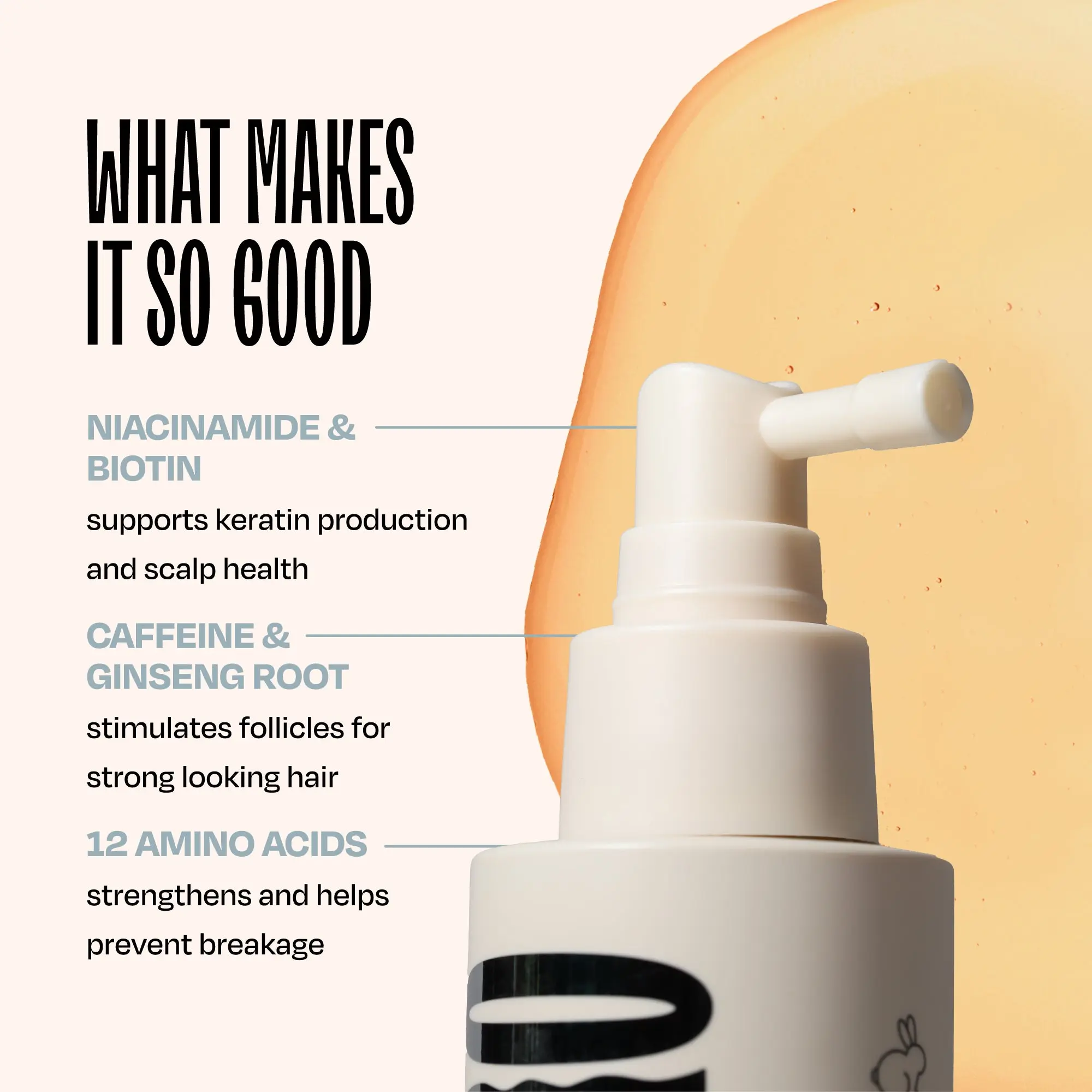 Help strengthen strands and support keratin production for more resilient hair. Stimulate the scalp for healthier, fuller-looking hair. Refresh and invigorate follicles to encourage healthy hair growth. Experience a healthier scalp and stronger-looking hair with our innovative scalp spray!