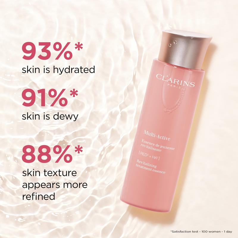 Powered by Clarins’ exclusive plant-based [Red² + H.A²] Complex—a proprietary blend of radiance-boosting Red Jania* and energizing Organic Red Ginseng* extracts and a double dose of hyaluronic acid that locks in moisture for 8 full hours¹—this ultra-lightweight, refreshing treatment essence addresses premature signs of aging and enlarged pores resulting from stress, lack of sleep, and a hectic lifestyle. Revitalizing Organic Teasel* extract boosts radiance. An essential step in your Multi-Active anti-aging routine—skin appears luminous, energized, plump, and more youthful looking day after day. The sensorial, water-fresh texture is absorbed into skin without feeling sticky, prepping skin for the treatments to follow.