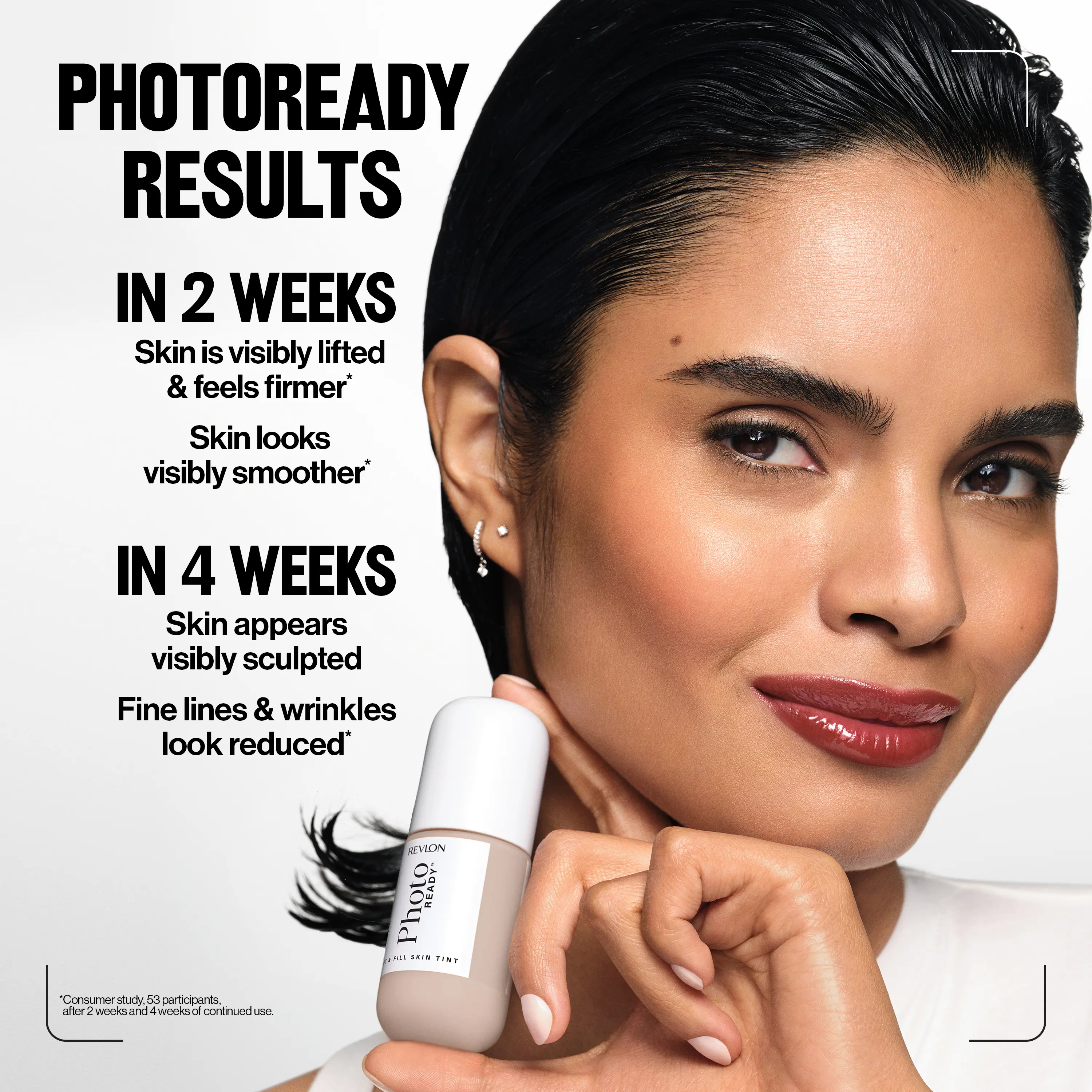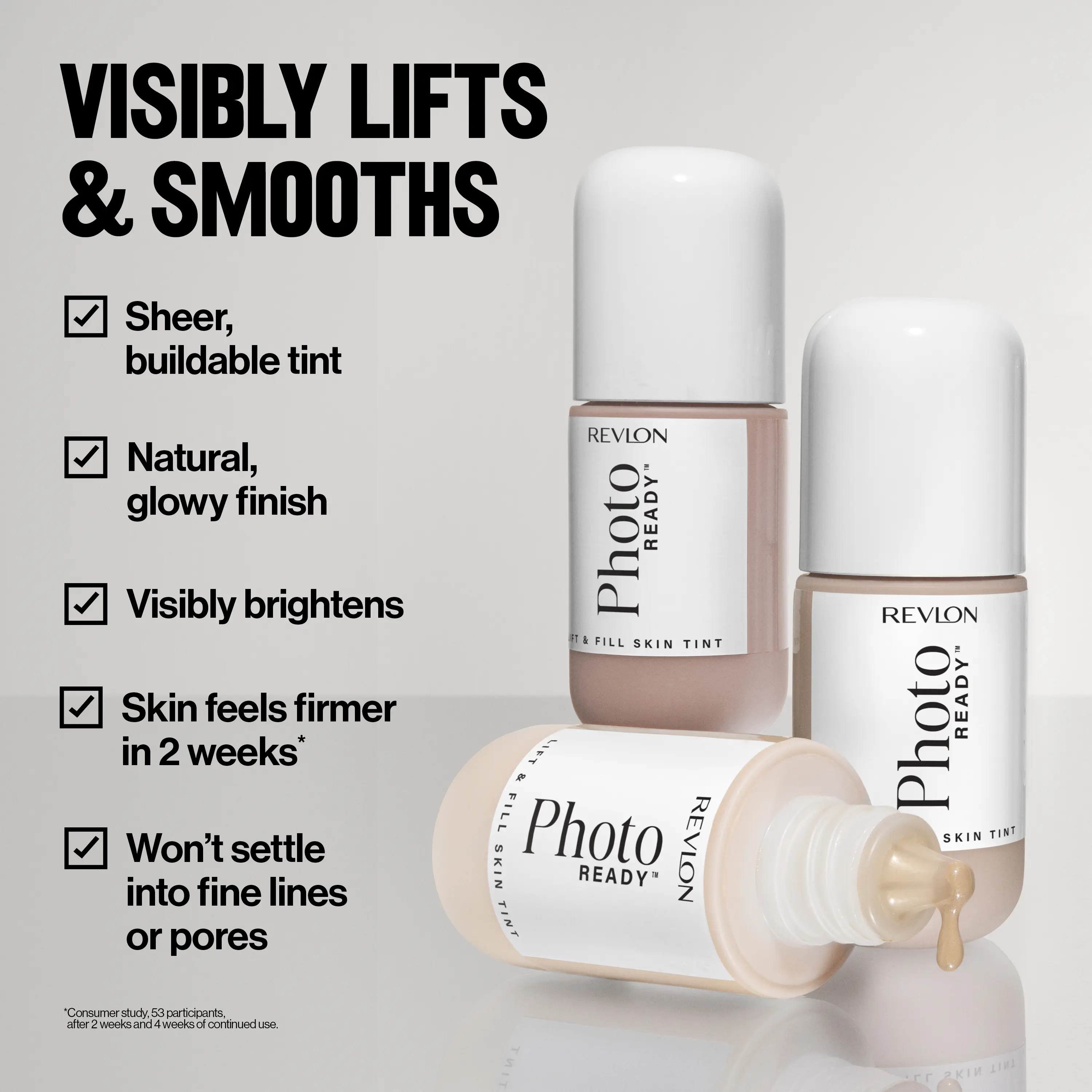 Get visibly lifted and visibly smoother skin with Revlon PhotoReady Lift & Fill Skin Tint. In just 2 weeks, skin feels firmer and filled-in, plus reduces the appearance of fine lines and wrinkles in just 4 weeks.* This breakthrough formula with patent-pending technology instantly evens skin tone, blurs the look of pores and imperfections, and delivers a sheer, glowy tint. It’s the perfect fusion of skincare and makeup—formulated with Stevioside to target fine lines and Squalane to visibly plump and hydrate. Easy-to-blend liquid skin tint. Buildable coverage. PHOTOREADY RESULTS: Skin looks visibly lifted & smoother in 2 weeks.* Skin appears filled in & feels firmer in 2 weeks.* Skin appears to have more bounce in 2 weeks.* Reduces the appearance of fine lines & wrinkles in 4 weeks.* Skin looks visibly sculpted & facial contours look more defined in 4 weeks.* Visibly minimizes expression lines in 4 weeks.* *Consumer study, 53 participants, after 2 weeks and 4 weeks of continued use. Are you PhotoReady? For the ultimate selfie-worthy look, check out our PhotoReady Collection—makeup inspired by derm-tweakments to instantly transform your look.