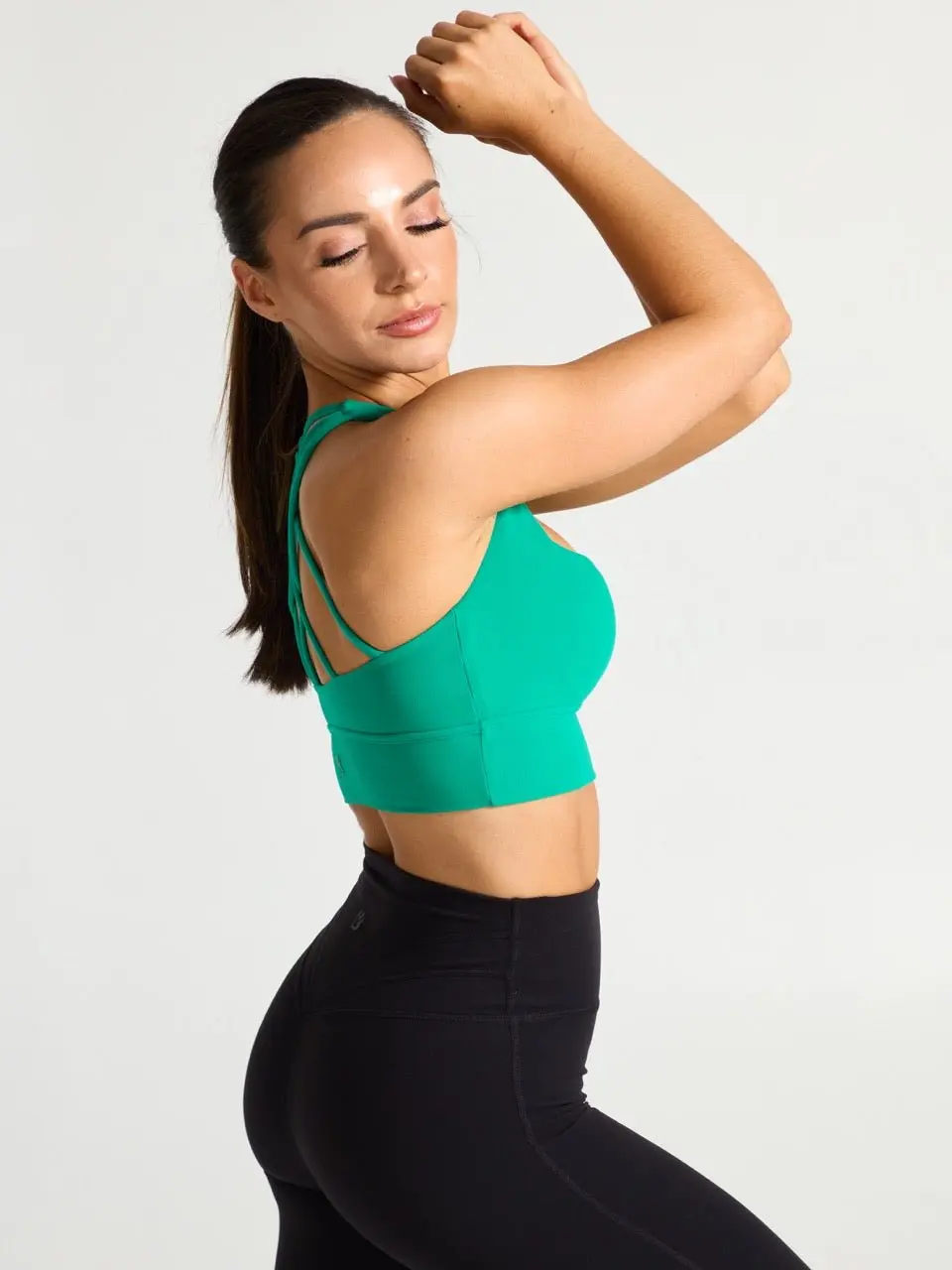 The Revolution Sports Bra is a flattering longline sports bra designed with a modern square neckline and a medium level of support to enhance your natural shape. The strappy back features a three-strap criss-cross design secured with a sleek metal ring for an elevated, statement finish.