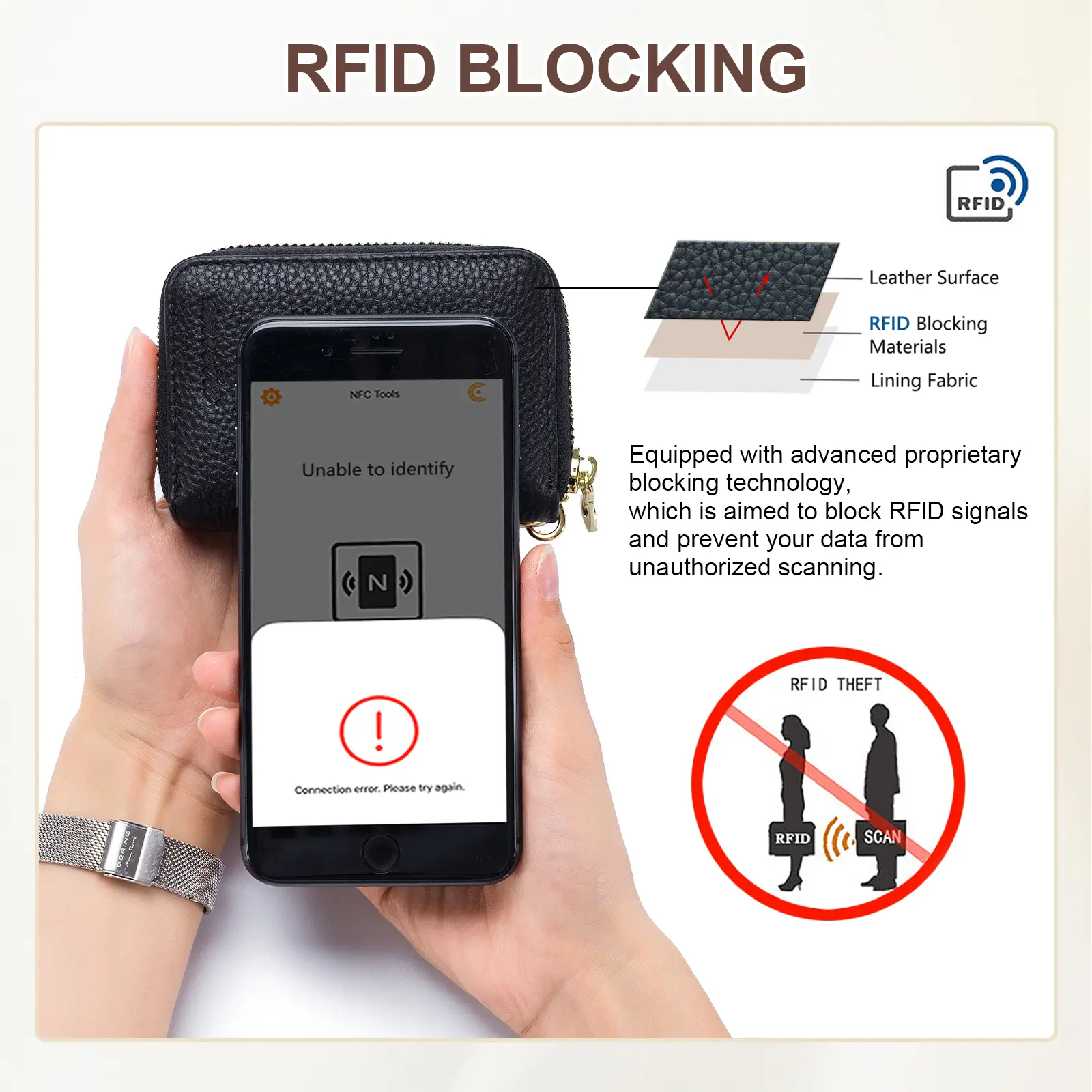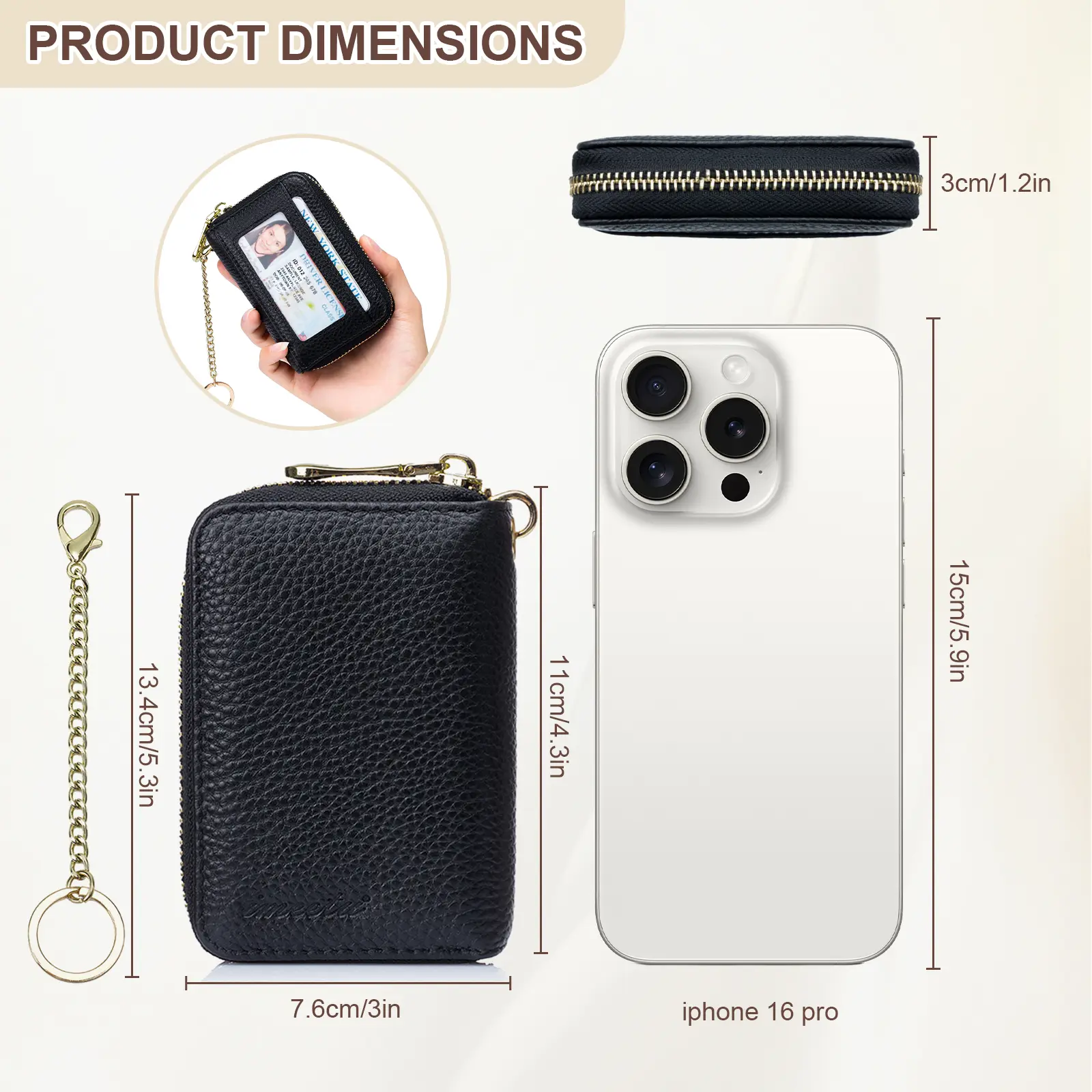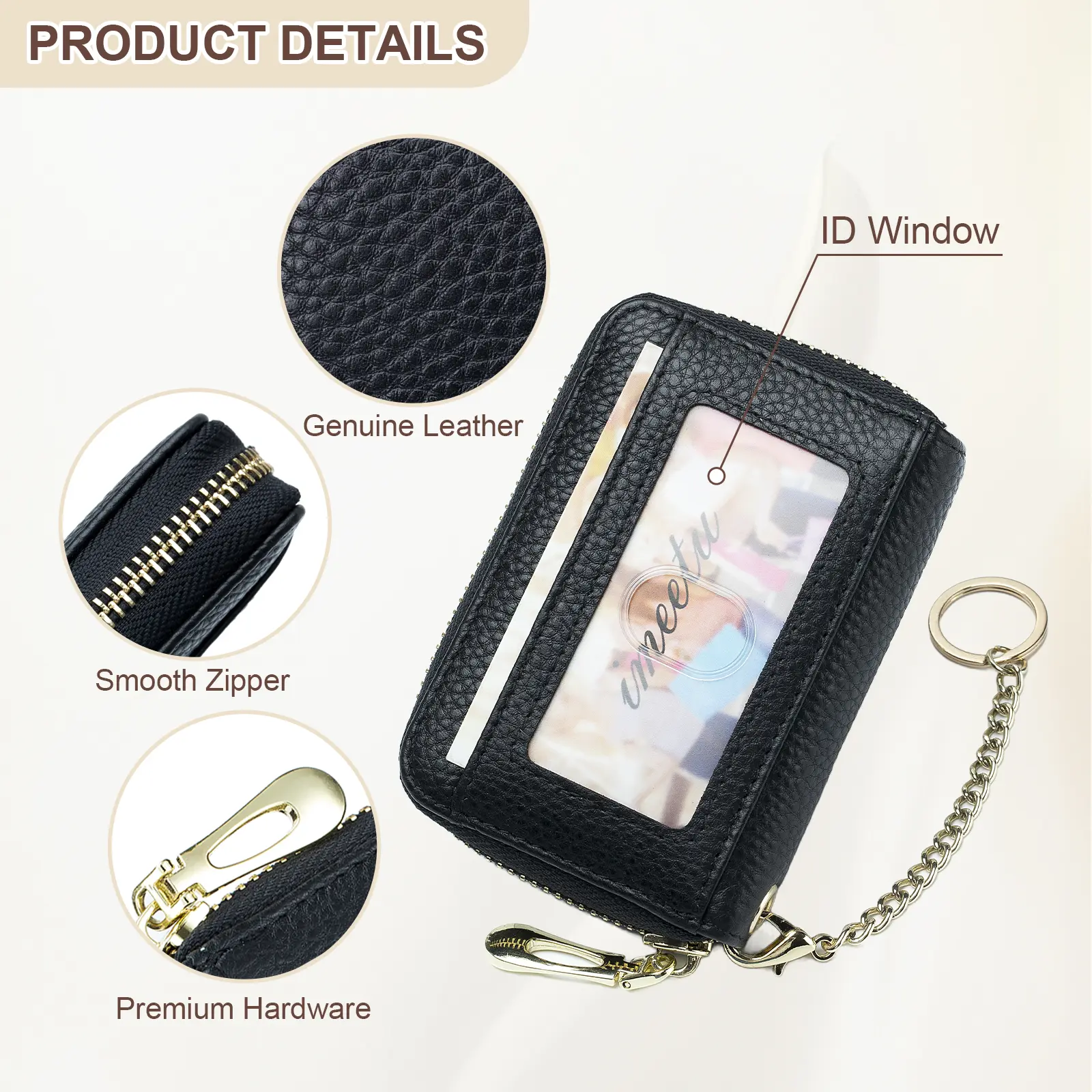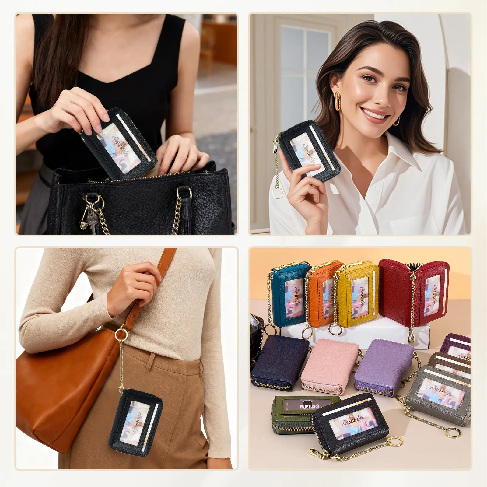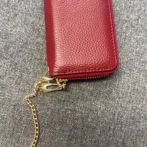 Super cute small wallet - material feels nice for the price, apparently will protect your credit cards, came nicely packaged w/ a small duster pouch inside (not pictured), price was great. I love the color, gold hardware & the amount of cards it can hold. Will be purchasing in more colors.