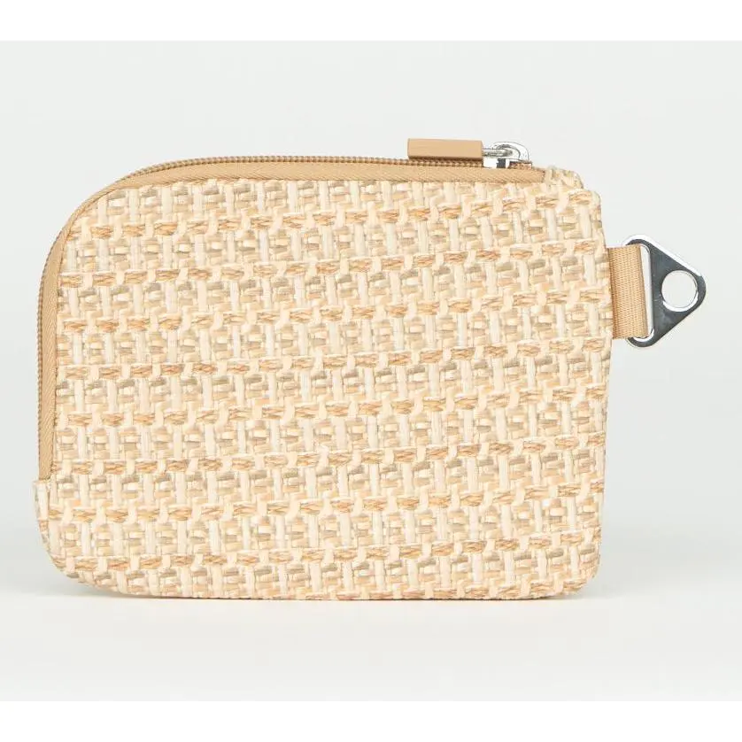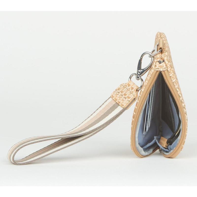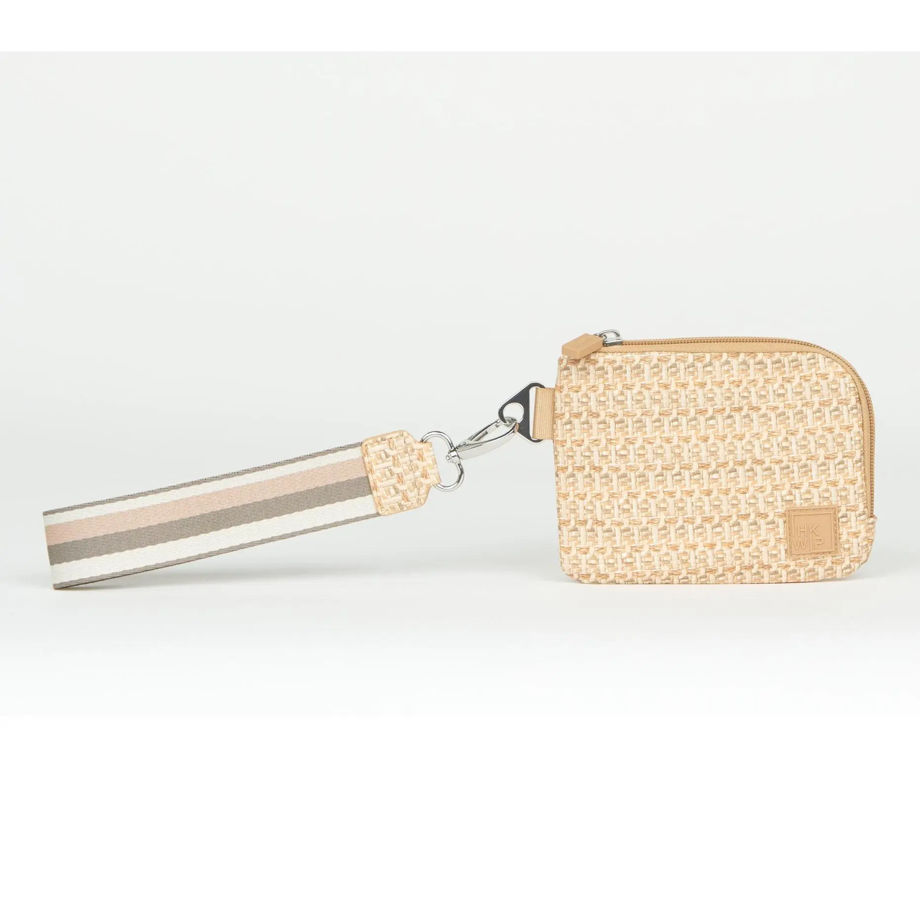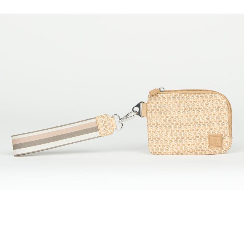 IHKWIP The RFID Everyday Essentials Wristlet Pouch. Includes removable striped wristlet strap. Zip top closure with gusseted opening. Light colored lining. RFID card slots and interior change zip pocket. Exterior clear ID window. Dimensions: 6.25"L x 1"W x 4.75"H. Weight: 3 oz. Body content: light denim: 100% polyester. raffia & rose gold: 70% polyurethane, 30% polyester. all others: 100% nylon. Lining content: 100% recycled polyester on all. COO: imported