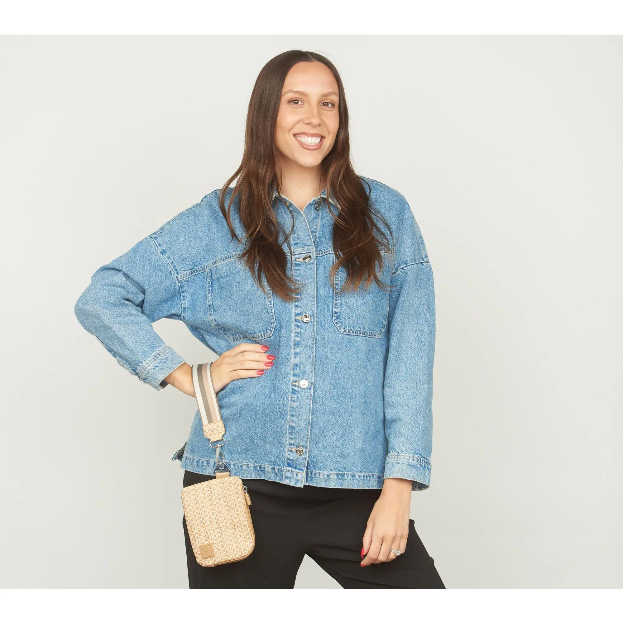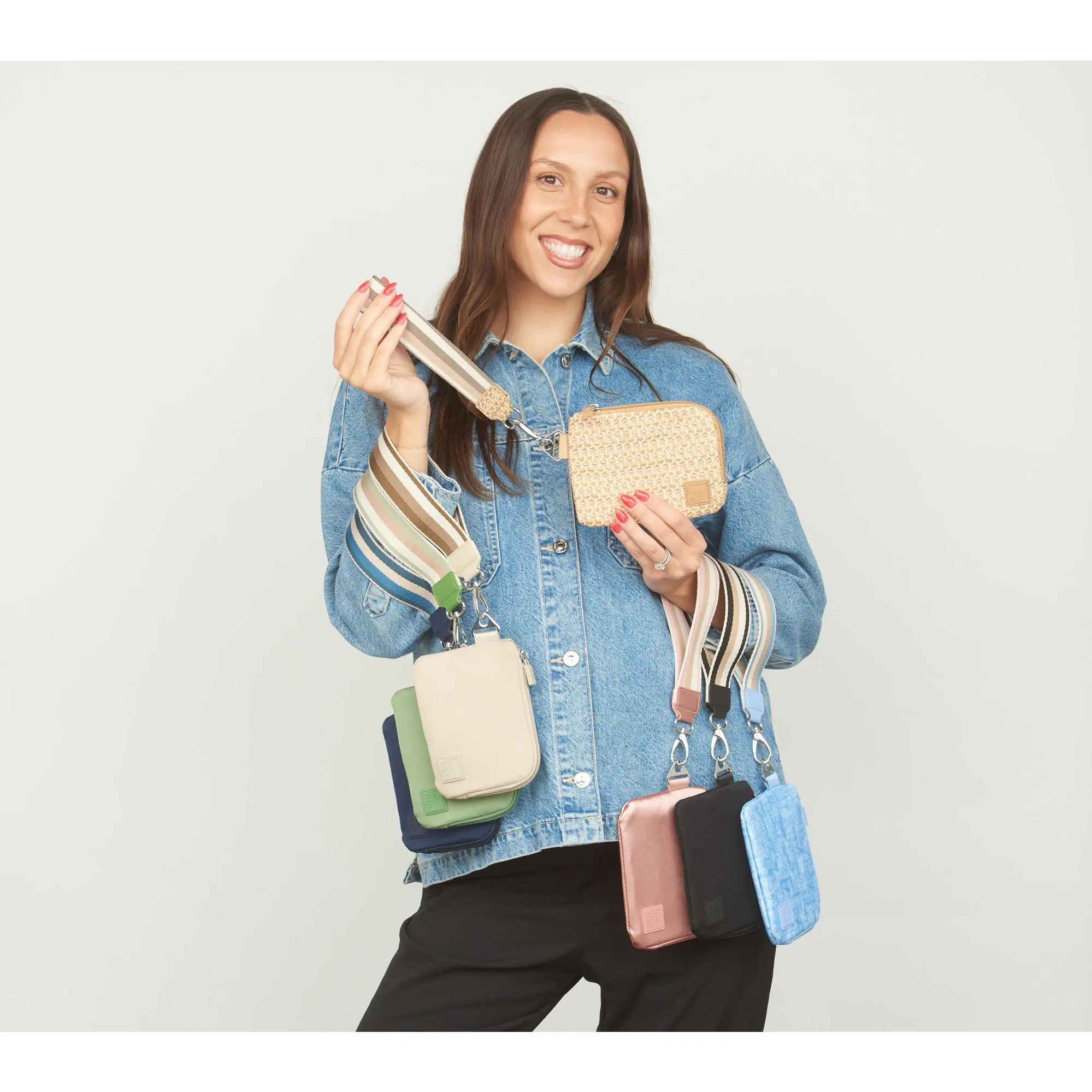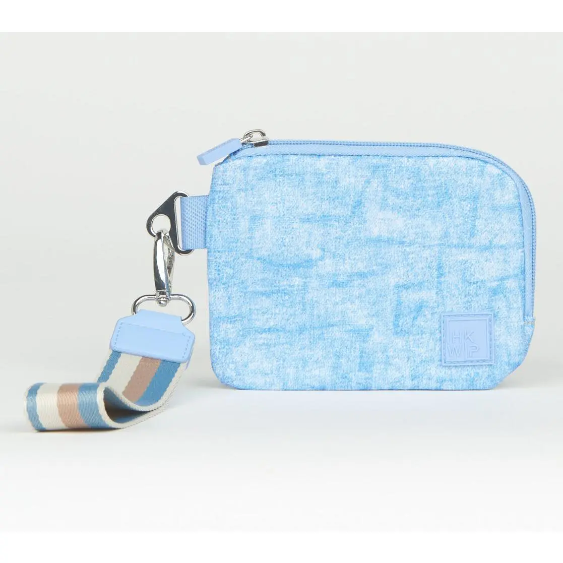 IHKWIP The RFID Everyday Essentials Wristlet Pouch. Includes removable striped wristlet strap. Zip top closure with gusseted opening. Light colored lining. RFID card slots and interior change zip pocket. Exterior clear ID window. Dimensions: 6.25"L x 1"W x 4.75"H. Weight: 3 oz. Body content: light denim: 100% polyester. raffia & rose gold: 70% polyurethane, 30% polyester. all others: 100% nylon. Lining content: 100% recycled polyester on all. COO: imported