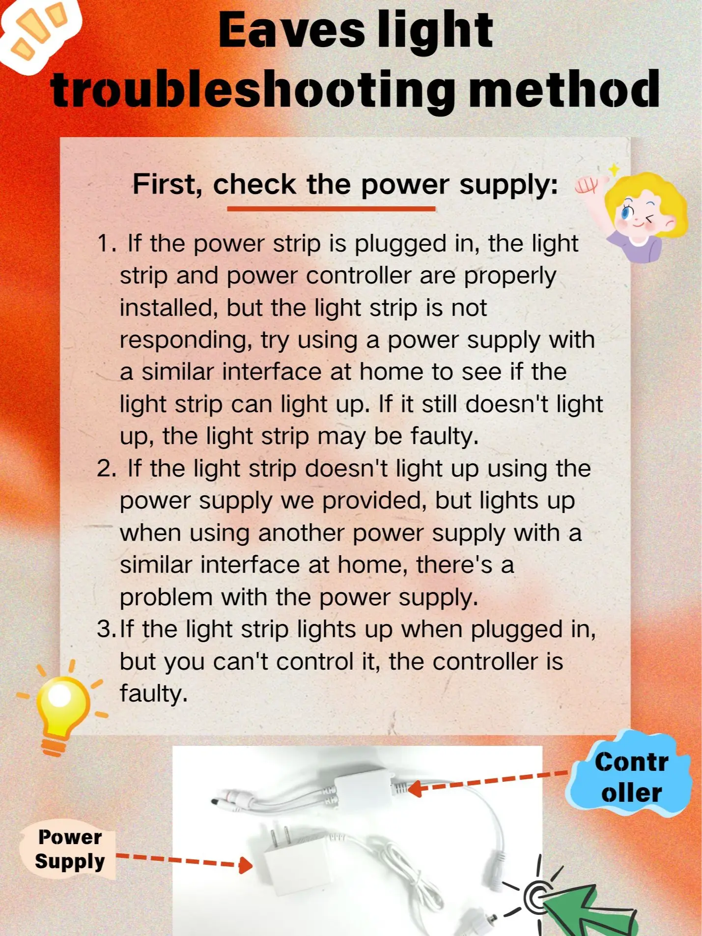 Replacement parts for power supply and controller for eaves lights, and replacement parts for 50Ft individual LED strips. Only applicable to RGB eaves lights sold in this store.