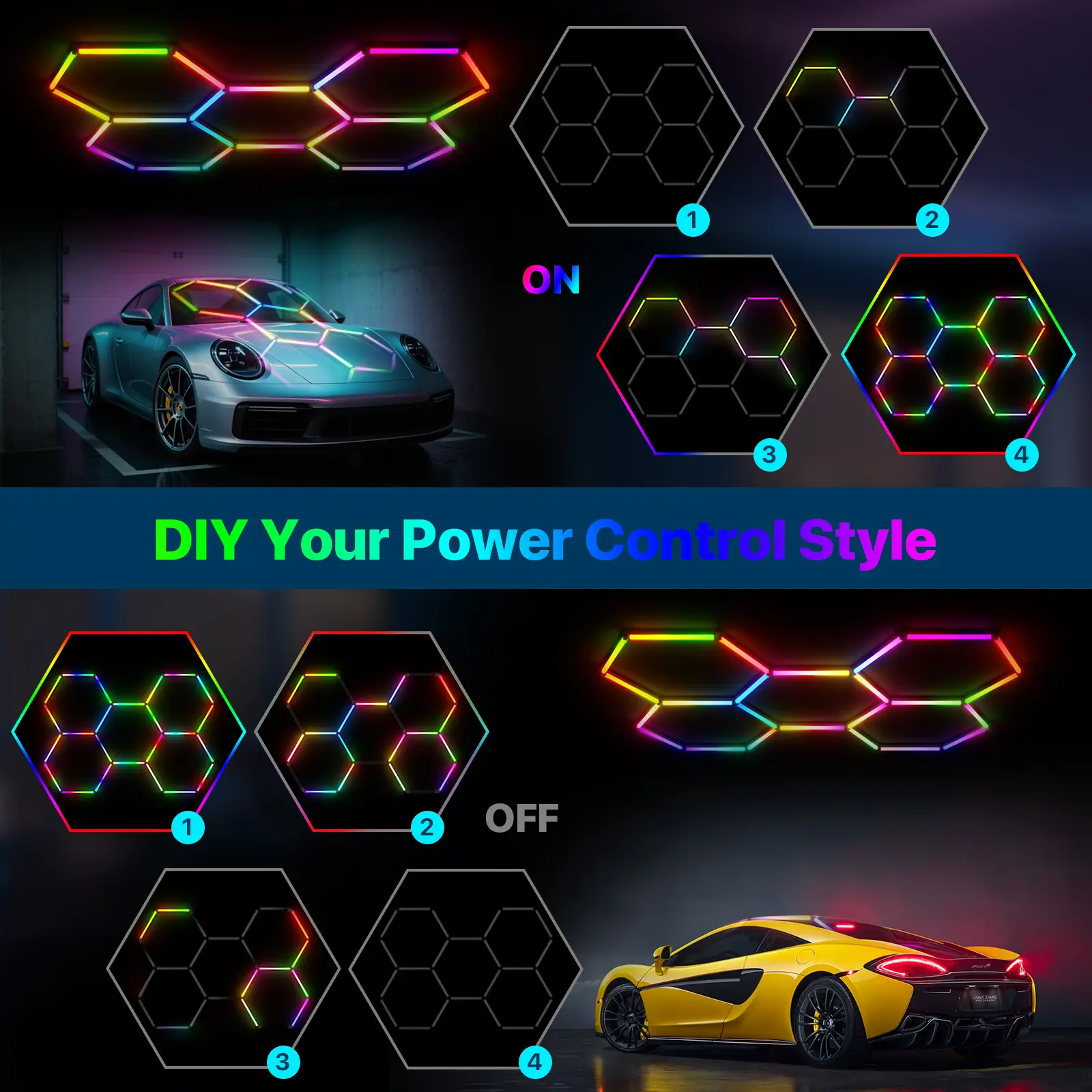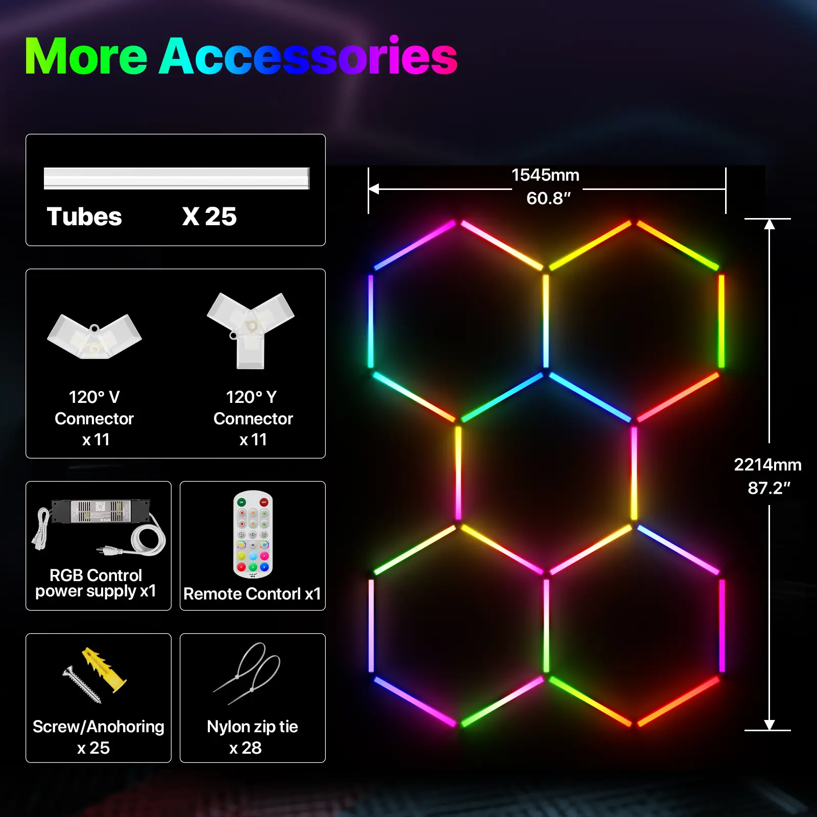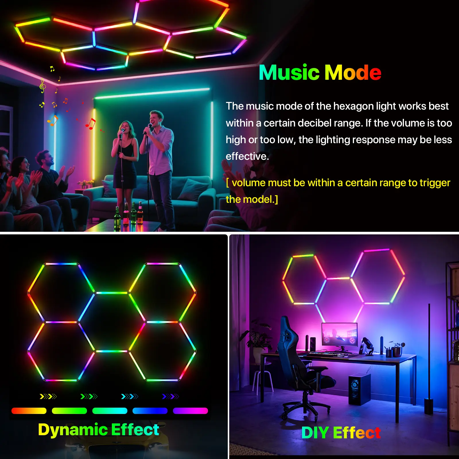 Upgrade your space with the RGB Hexagon LED Wall Light. This smart modular honeycomb lamp combines dynamic effects, music synchronization, and DIY color modes to bring your room to life. Control each LED panel with the app or 2.4G remote, and easily arrange panels in custom hexagon patterns. Lightweight and made of durable PC material, these LED wall panels are perfect for gaming rooms, parties, streaming setups, offices, or garages. Bring vibrant, customizable, energy-efficient RGB lighting to your home.