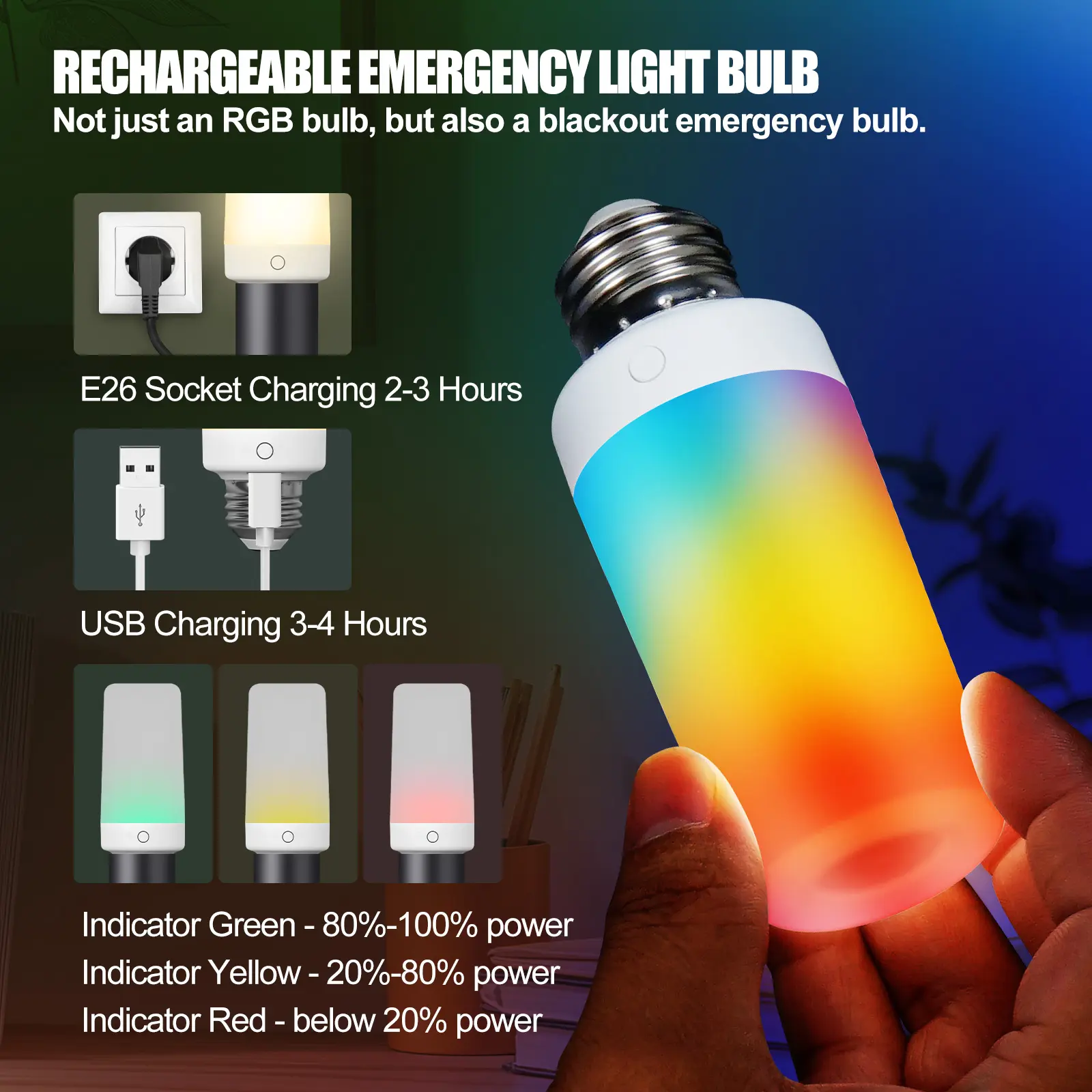 DEBAOBULB RGB Fire LED Emergency Light Bulb- 120V Brightness, 5 Lighting Modes & Dual Charging for Power Outages & Camping