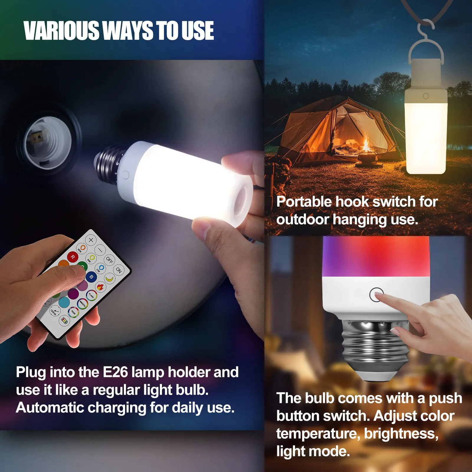 The DEBAOBULB isn’t just an emergency bulb—it’s your ultimate lighting companion. Engineered for reliability during sudden power cuts, its dual-charging design ensures you’re never left in the dark. Whether illuminating a storm-safe room or setting mood lights for a campsite party, experience vibrant colors and adaptive brightness that redefine portable lighting.
